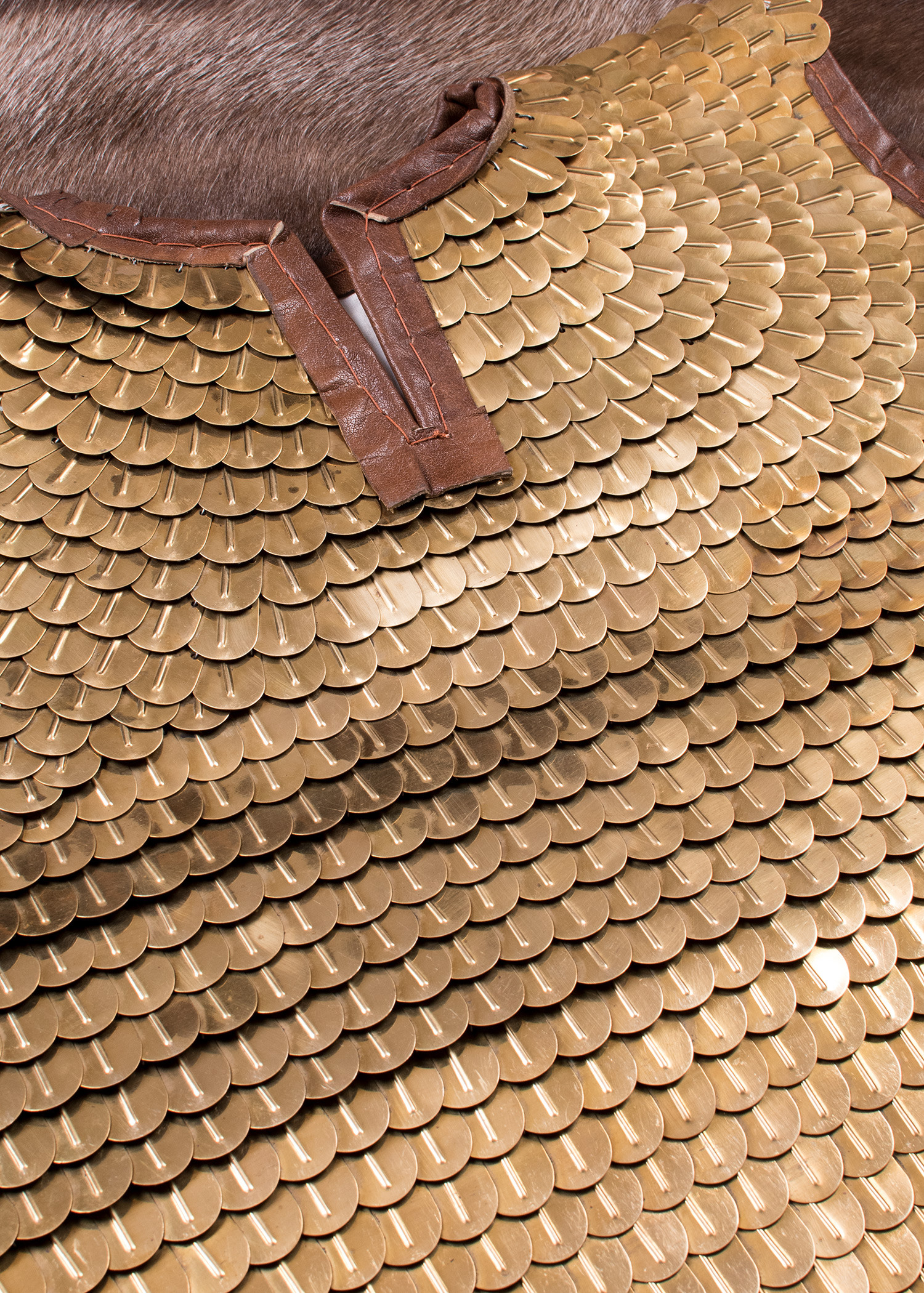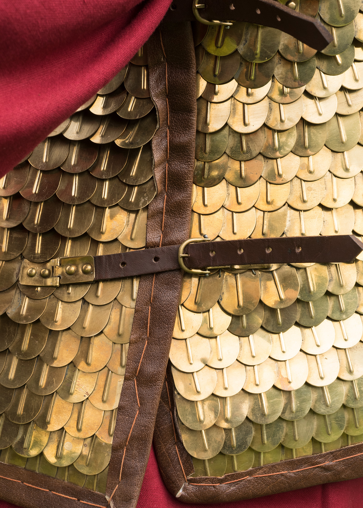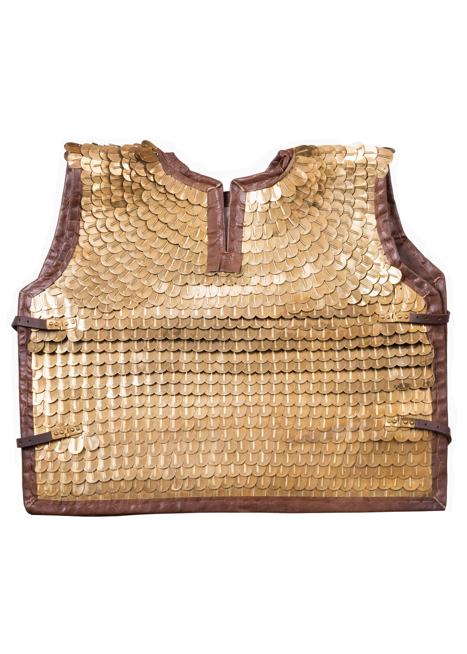 Lorica Squamata of Roman scales. High quality replica of a Roman scale armor. This typical armor of Roman Imperial cavalry consists of multiple brass scales, similar to fish scales, which are sewn onto a solid leather and canvas vest and intertwined with wire on the longitudinal sides. This construction pattern should prevent the opponent's blades from going through the metal plates.