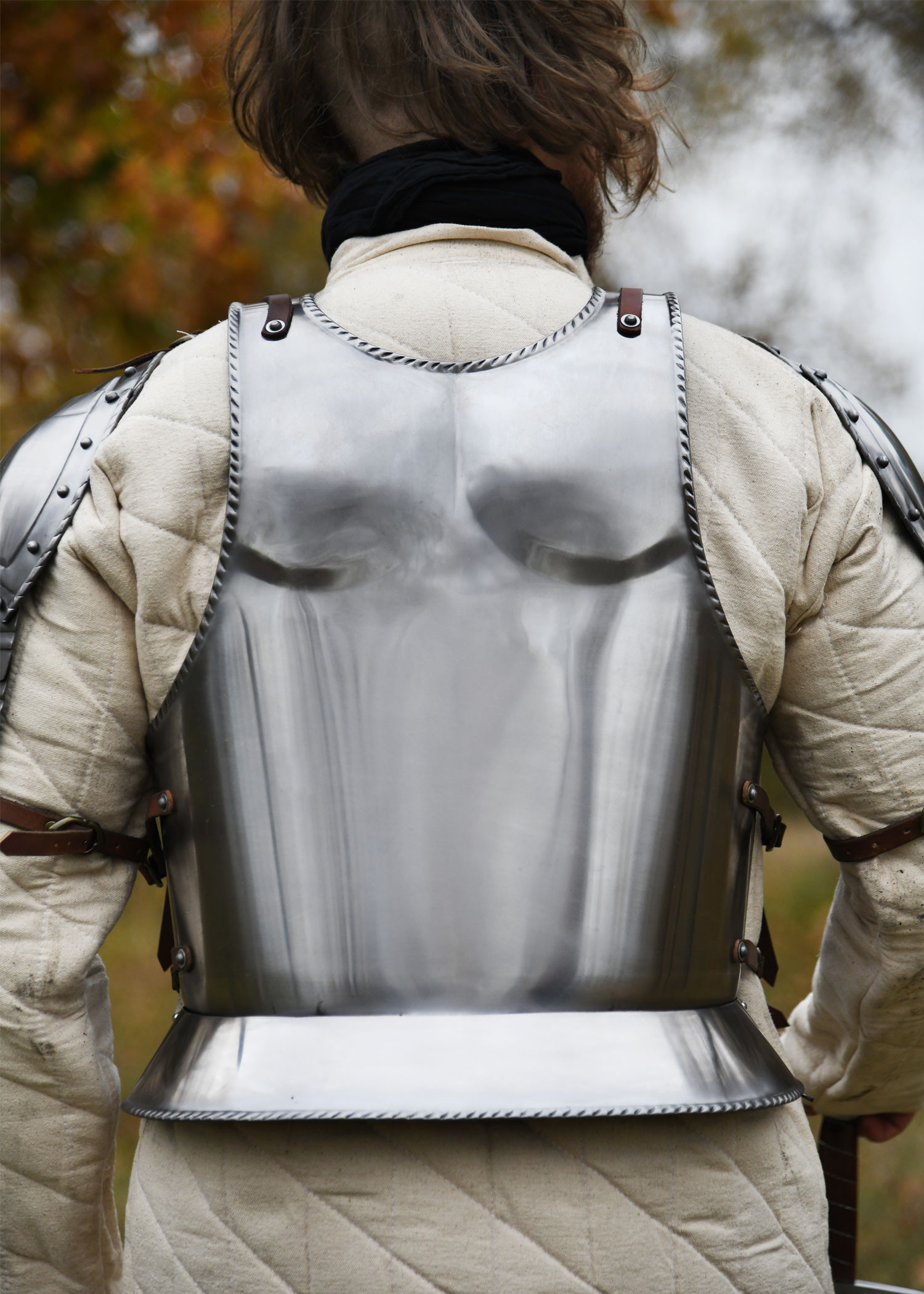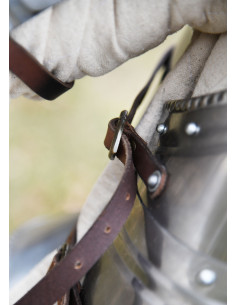- Custom Fit: The two halves of the set fit around the body and secure with adjustable leather straps (3mm thick) and brass buckles. This allows for a secure and comfortable fit for a variety of sizes.