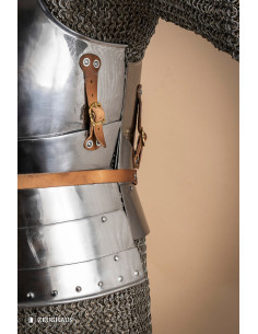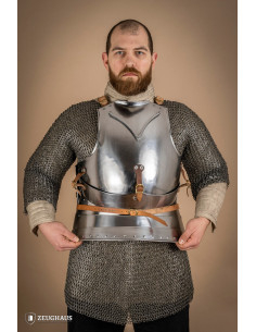 The front and back pieces of this breastplate are securely joined together by a series of leather straps and clasps, ensuring a reliable and comfortable fit that will allow you to move freely on the battlefield. For maximum protection, wear it over a gambeson, completing your medieval armor set with style and functionality!