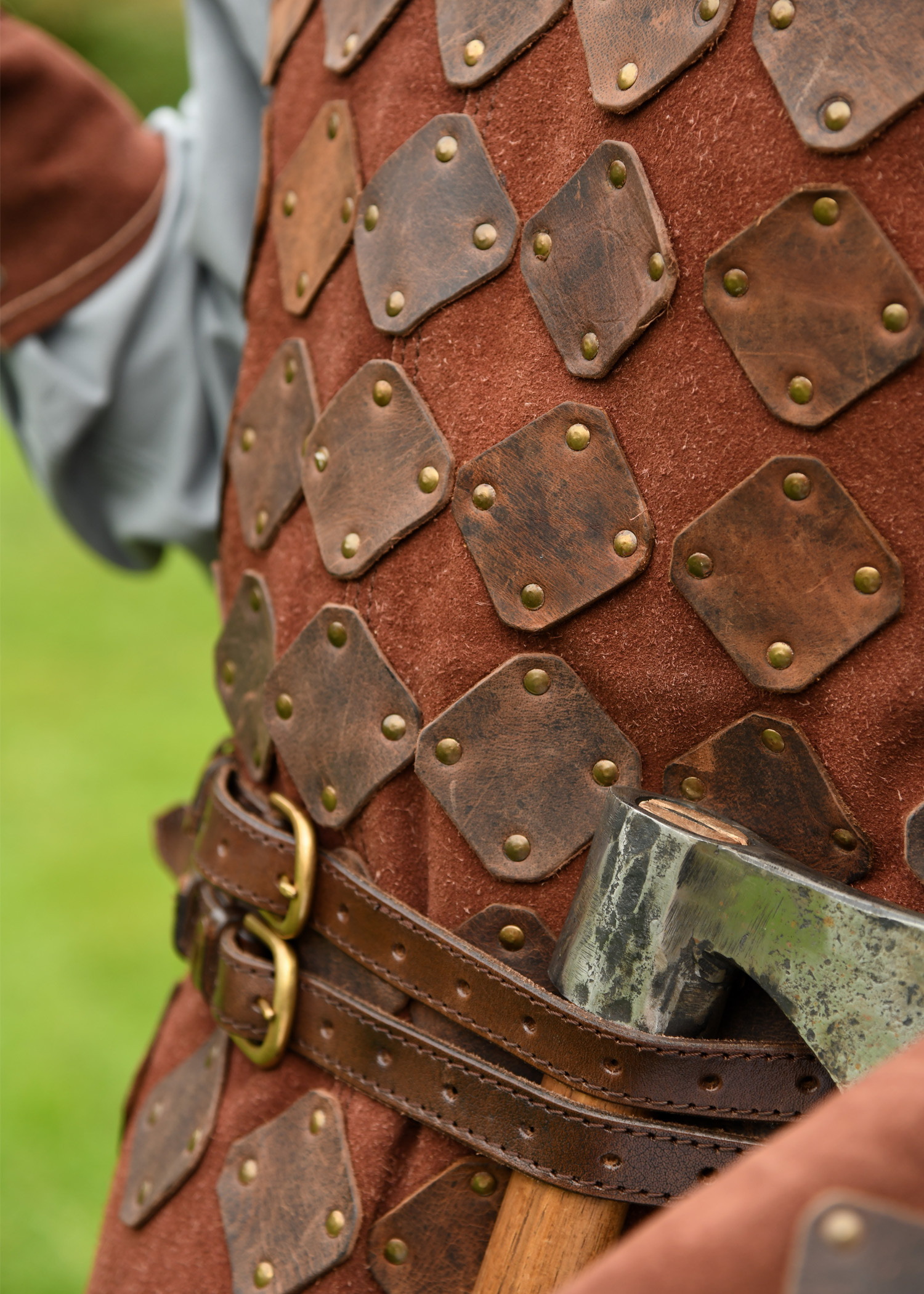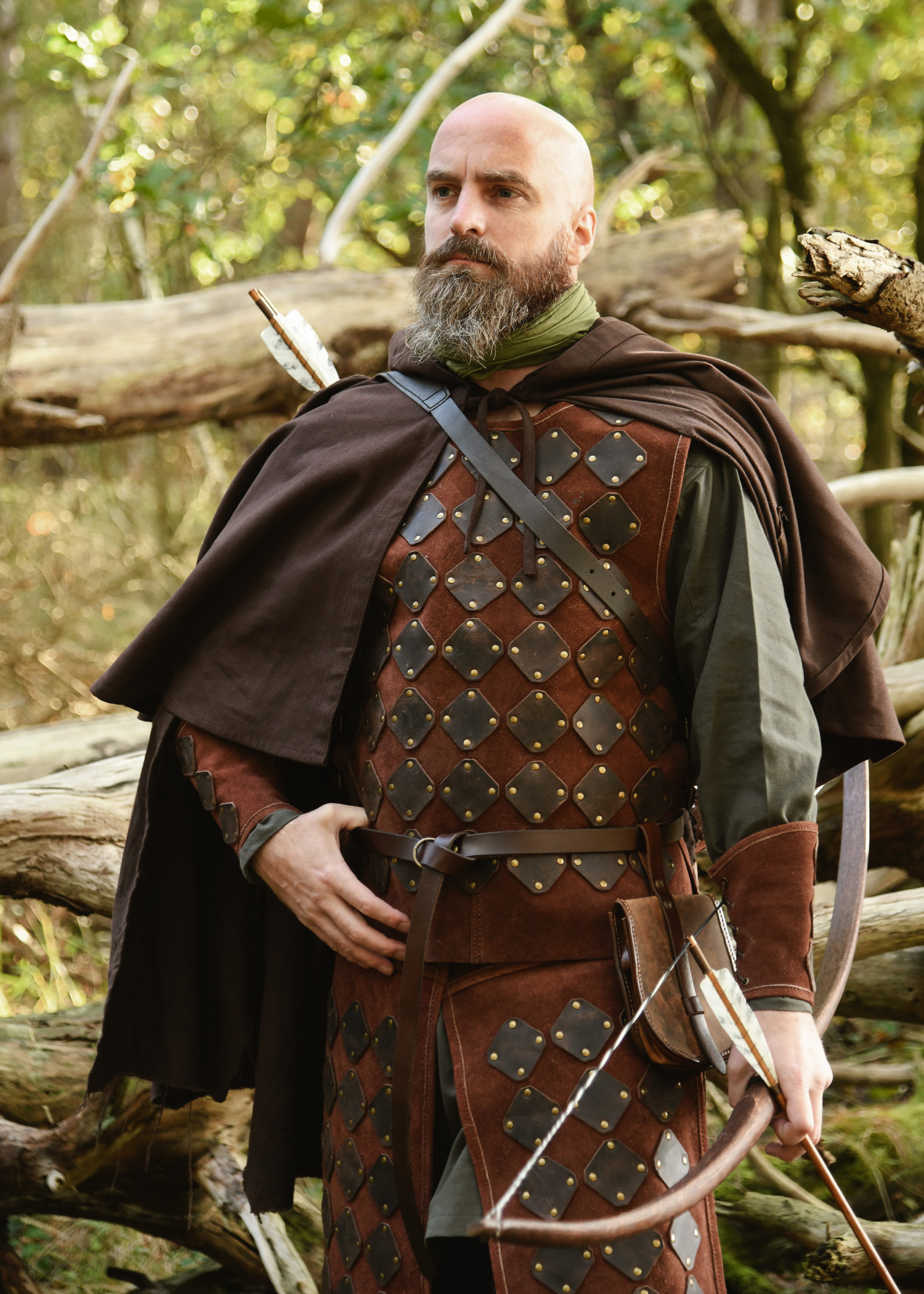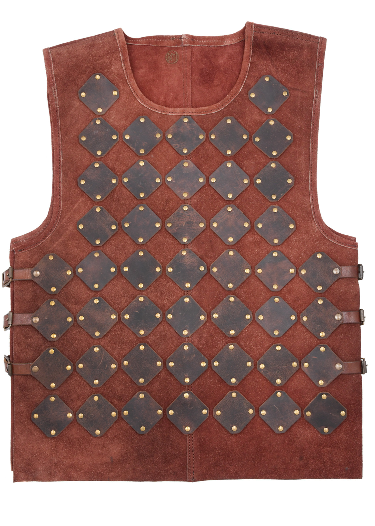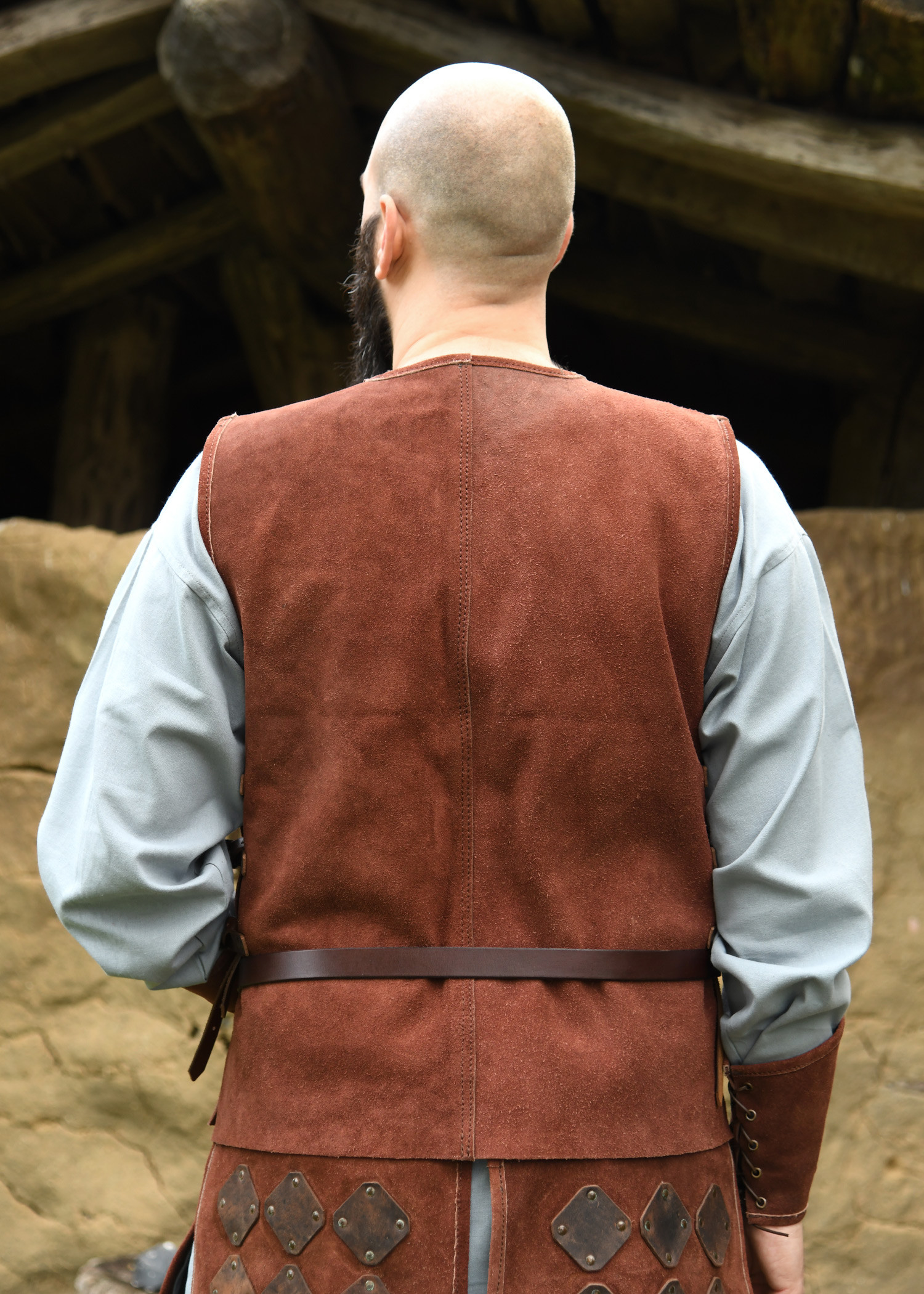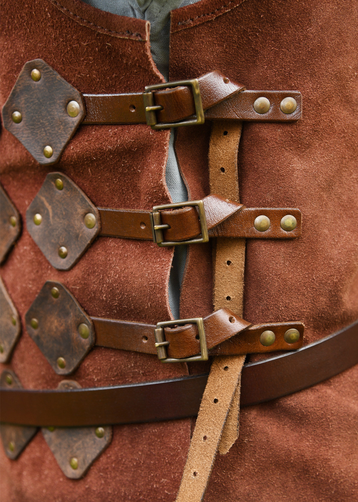Made of soft vegetable suede leather, this tunic guarantees exceptional freedom of movement and lasting durability. Its design, featuring riveted oiled leather panels, evokes the aesthetic of a medieval brigandine, adding an authentic touch to your outfit. The softness and flexibility of the suede ensure that the tunic is comfortable even during long hours of wear, such as at a medieval market. Additionally, three leather straps with buckles on each side allow for a fully customizable fit, ensuring a secure and comfortable wear. The arm openings and neckline are finished with a fine leather edge, enhancing both comfort and refined appearance.