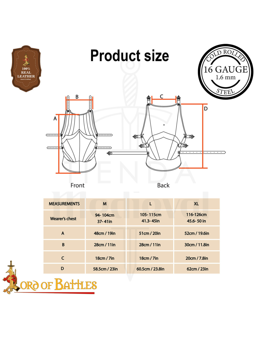 Are you looking to look like a medieval knight with an authentic and durable armor? Our Medieval Gothic Steel Breastplate (caliber 16) combines history, style, and protection in a piece that stands out in any historical or cosplay setting.