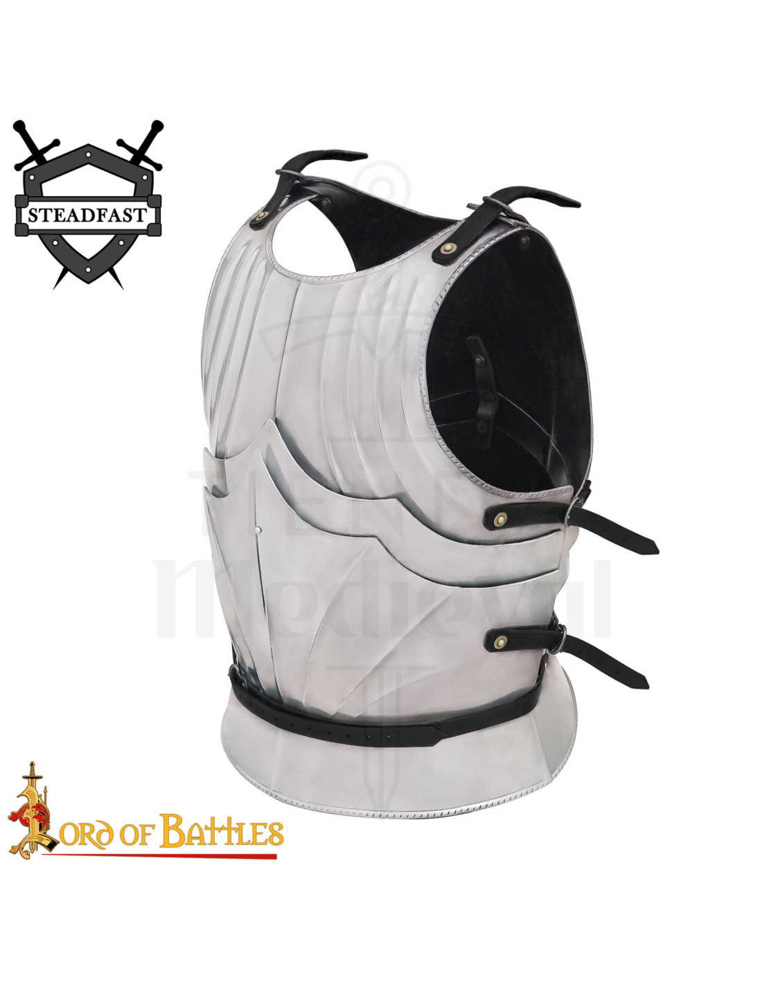 Inspired by armor from the 15th and 16th centuries, this breastplate reflects the evolution of European knights' defensive gear. Its grooved design, typical of the Gothic era, not only provides an impressive visual impact but also strengthens the structure, offering greater resistance to blows without adding extra weight. The combination of curved lines and decorative details makes this piece both functional and visually striking.