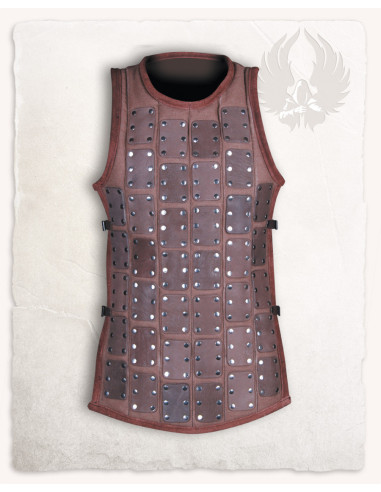 The symmetrical arrangement of rectangular plates on a leather base creates a robust and balanced appearance that enhances the torso without limiting gestures. The image shows how the brigandine integrates with laced forearm covers and a leather belt, creating a coherent and authentic set, ideal for completing a historical scene or a warrior character.
