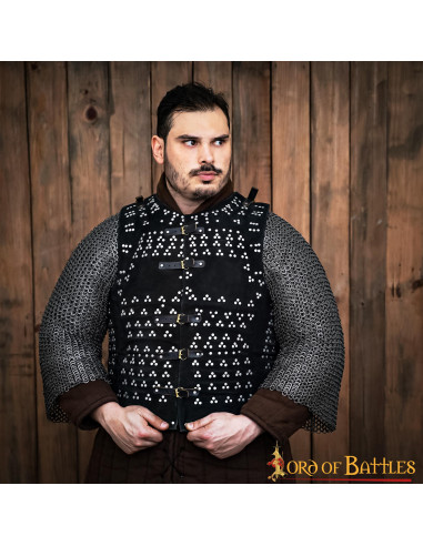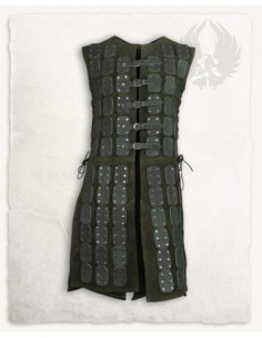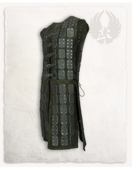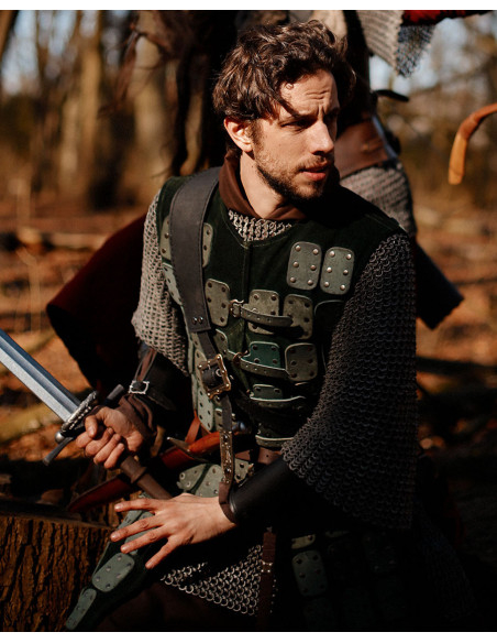 The construction in dark green suede provides a soft touch and elegant presence, while the reinforced plates add defense where it matters most, without compromising freedom of movement. The result is a piece that combines comfort with security, designed for you to move confidently during long days of historical reenactment or events.