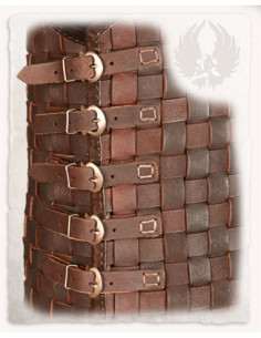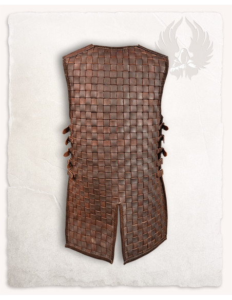 The interlacing of leather strips creates a square pattern with a dark brown finish that conveys rustic character and careful craftsmanship. This woven structure not only looks good but also provides flexibility where you need it, allowing the chest to adapt to your movements while maintaining a consistent and secure silhouette.
