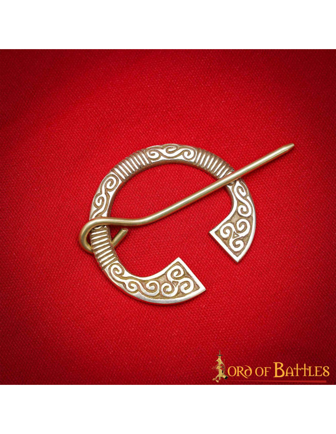 We present you the incredible Celtic brass fibula, a unique and special piece that cannot be missing from your collection of accessories. This Celtic fibula is decorated with trisquettes and knots, giving it a unique look and full of history.