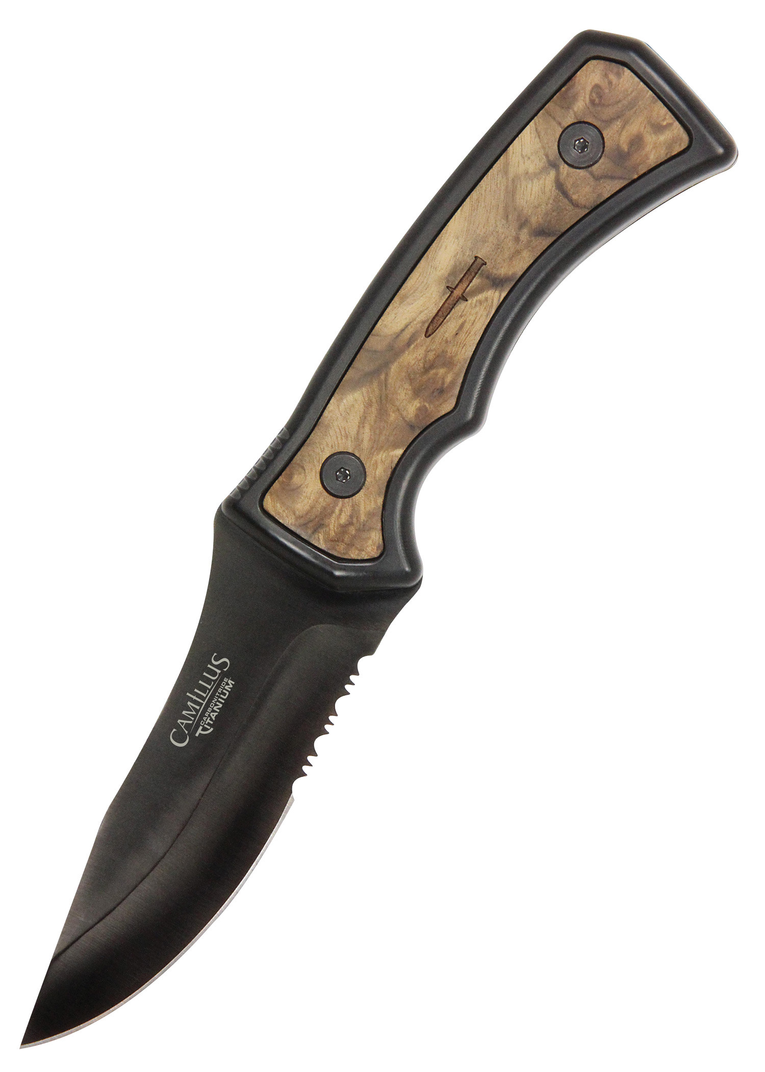 - High-quality AUS-8 steel blade: With a 10.5 cm blade made of AUS-8 steel, this knife offers an exceptional combination of hardness, edge retention and corrosion resistance. The black blade features a hollow drop point with partial serration, ensuring versatility and performance in any situation.