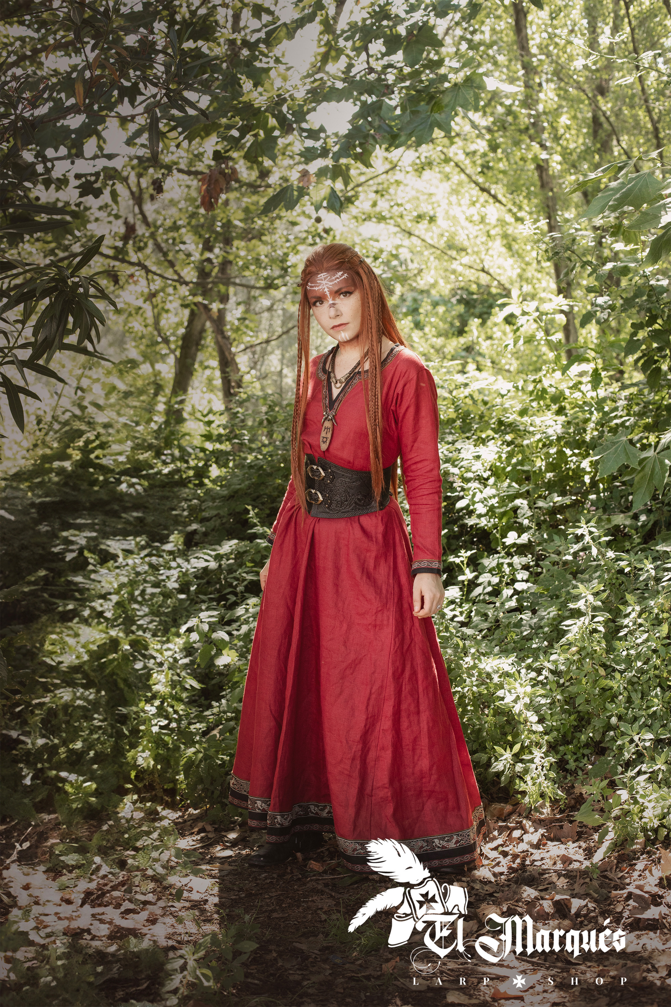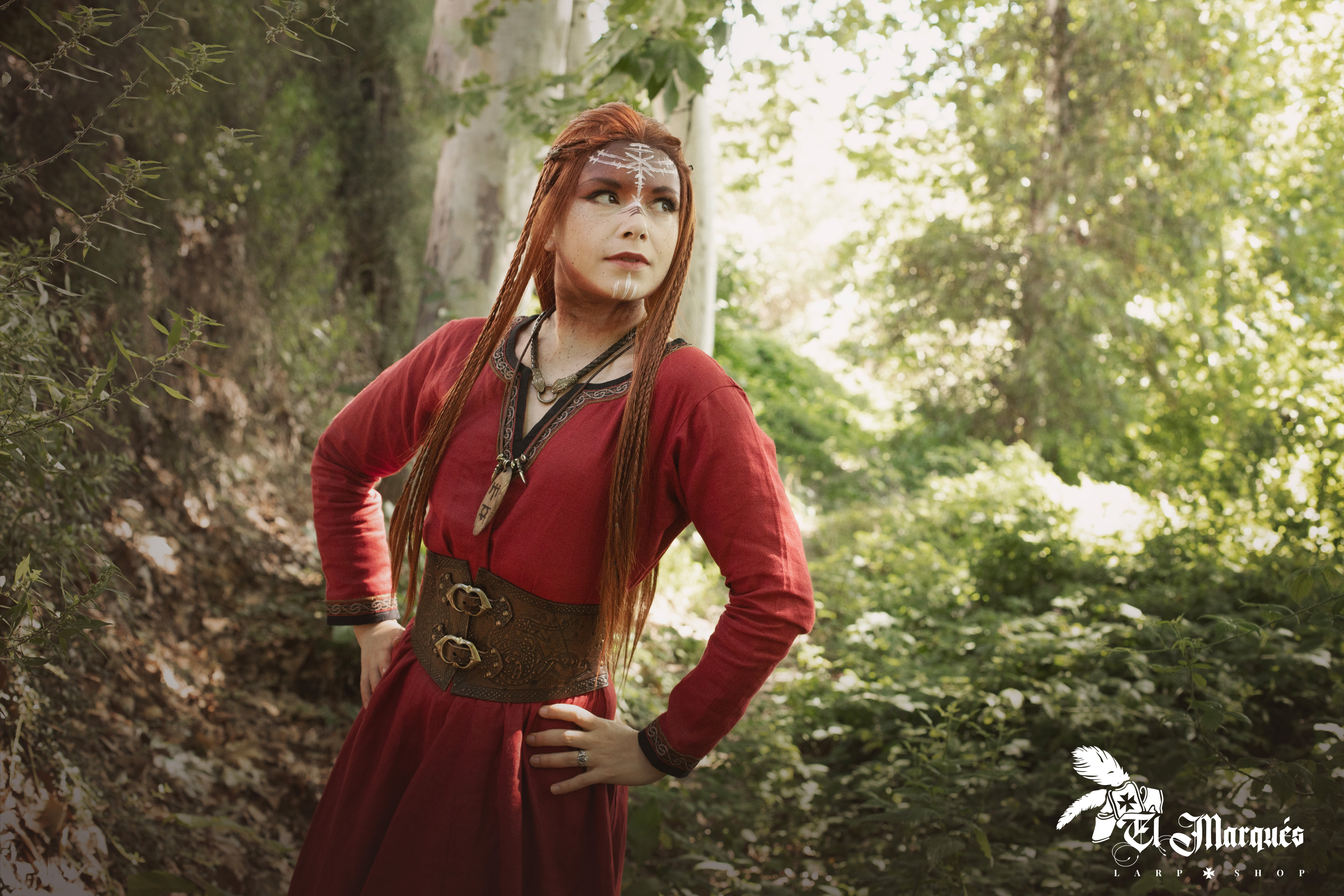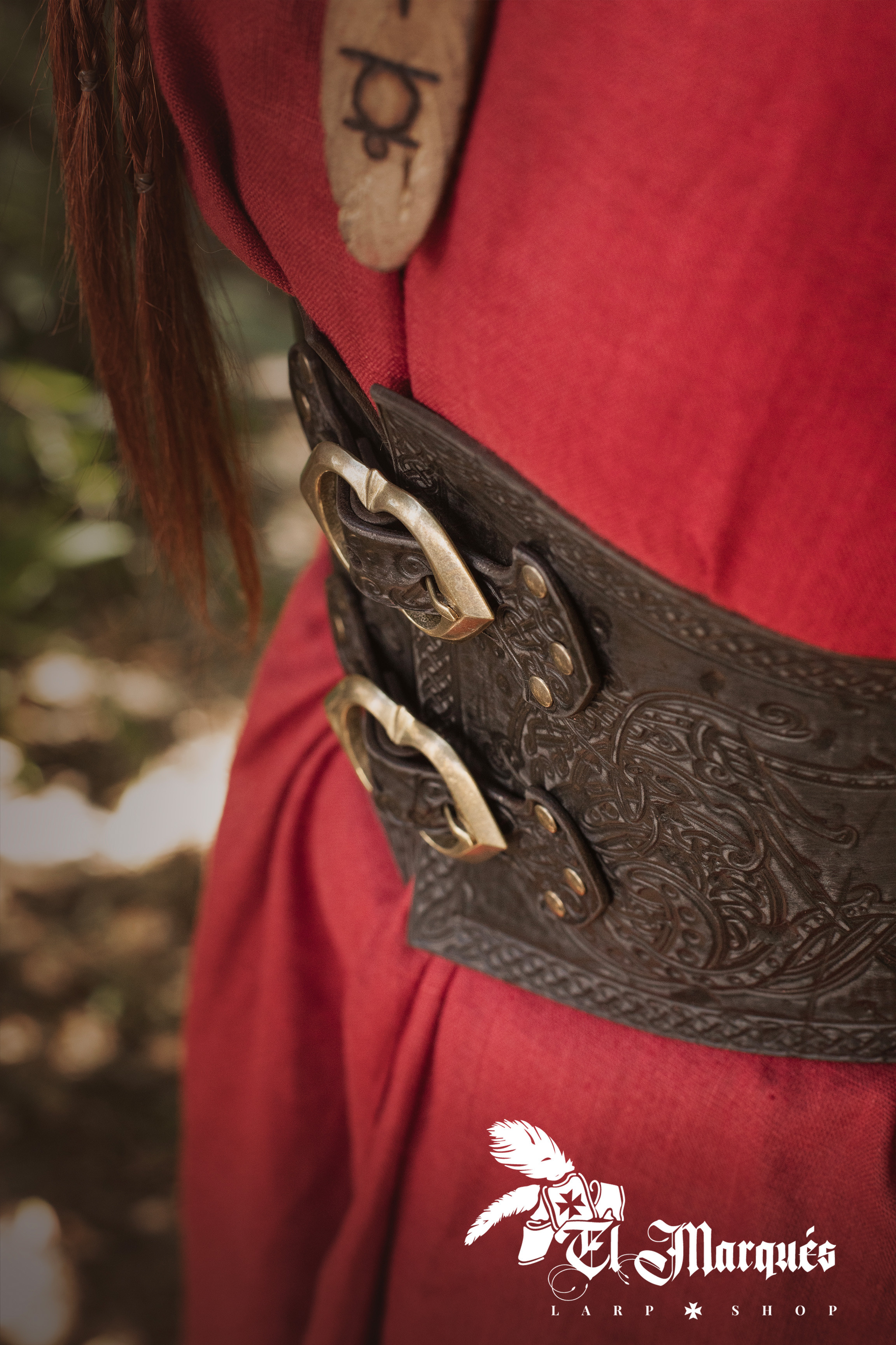 This belt is not only functional but also highly decorative. Its design evokes Nordic and Celtic motifs engraved in the leather, making it a unique and eye-catching piece. Its dominant presence stylishly covers the waist, enhancing any medieval or fantasy outfit you choose to wear. Whether you are exploring imaginary territories, leading your clan in a live role-playing game, or simply looking to bring your personal saga to life, this accessory will be your best ally.