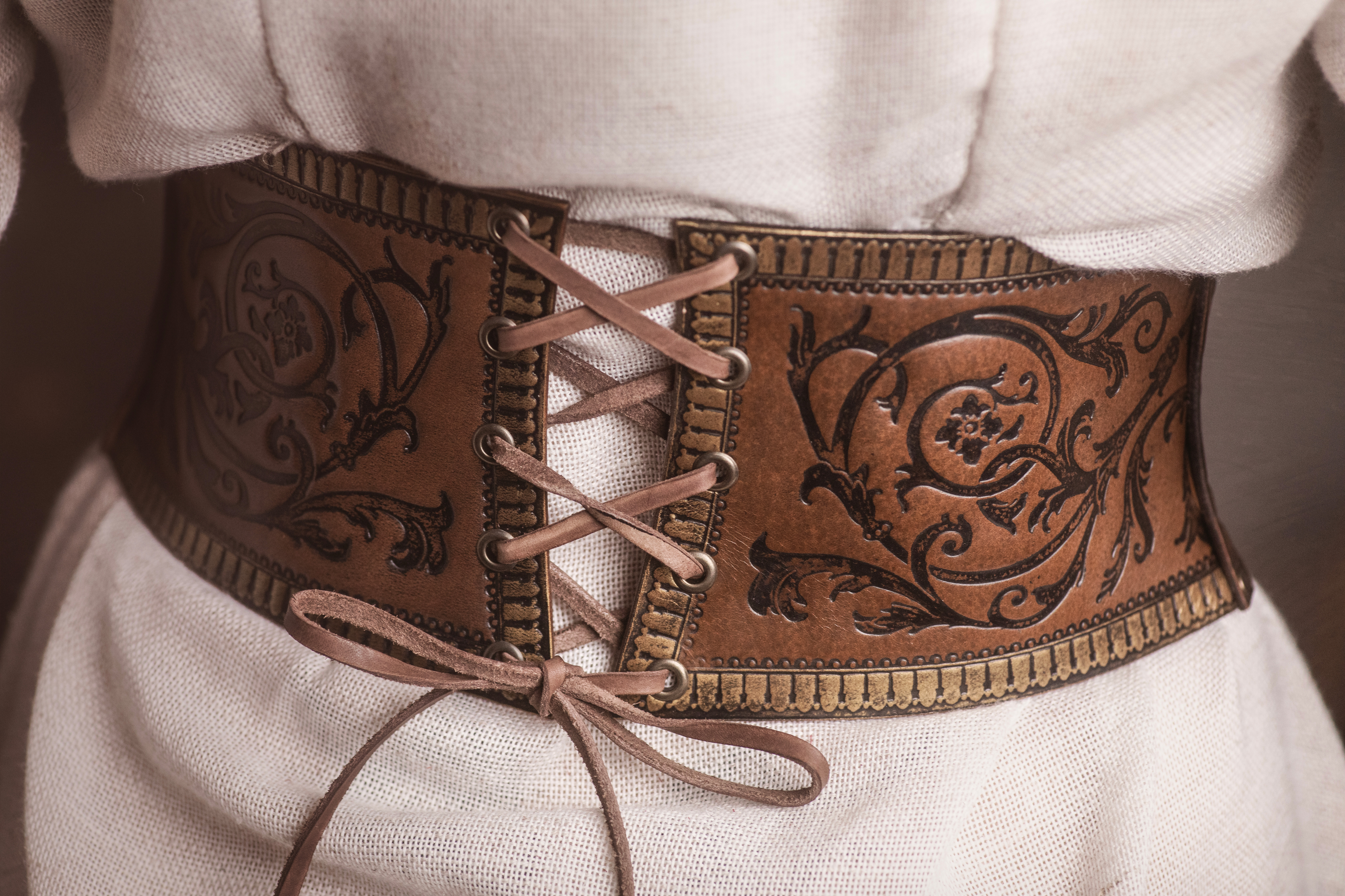 Handmade with high-quality leather, this belt incorporates a thickness designed to ensure durability and comfort in equal measure. Its fine brocades in brown tones, finished with hand-painted golden edges, provide a sophisticated and eye-catching touch, while the lace back not only evokes a romantic air but also allows for precise adjustment to your figure. Additionally, its two front brass buckles, besides being functional, add a unique and original character to the design.