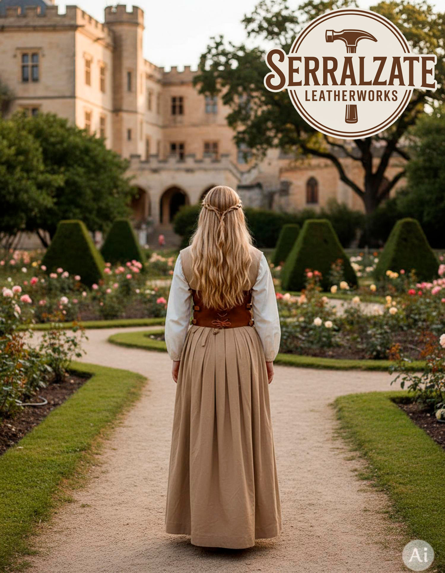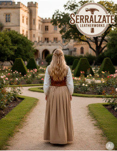 If you're looking to buy the Adventurous Princess Corset in leather, here you find a piece designed for those who value the authenticity of artisan craftsmanship and versatility in dressing. It is shown over a white blouse for reference, although the item for sale is solely the outer piece.