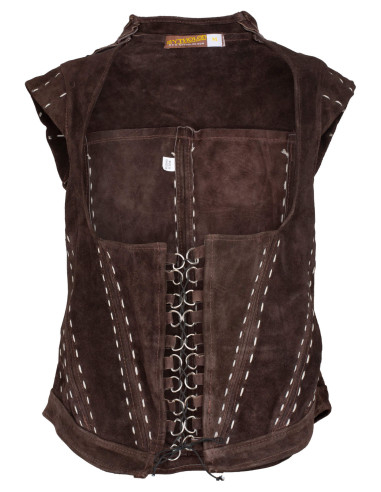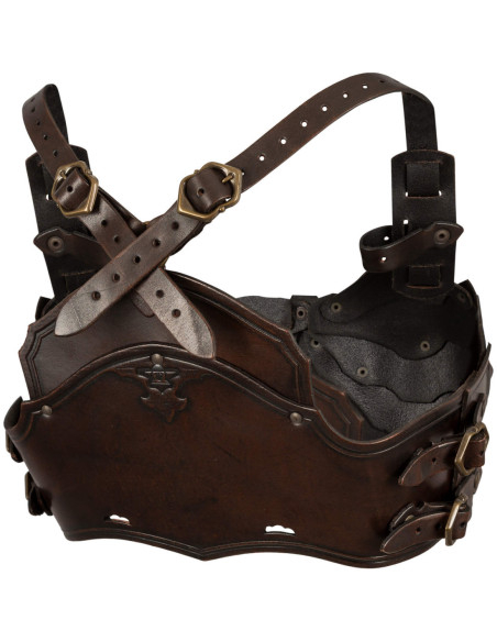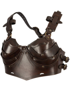 The hand-worked leather offers a weathered and robust aesthetic, which also protects the torso and accompanies every movement with firmness and freedom. The curved plates and embossed details shape the silhouette, elegantly highlighting the bust and waist, while the metal rivets reinforce the joints, giving an artisanal and reliable appearance. If you are looking to buy a Medieval Leather Corset Model Lilith, Brown Color, you will find a piece designed to combine warrior presence and sophisticated finish.
