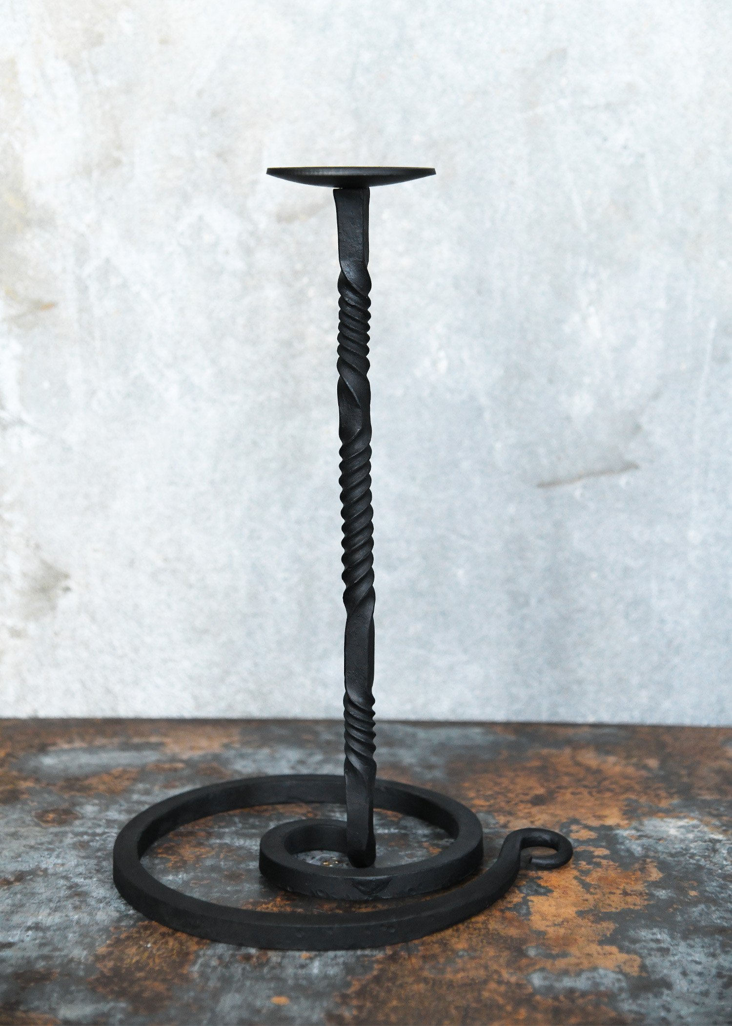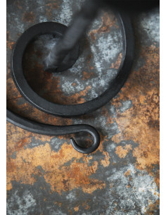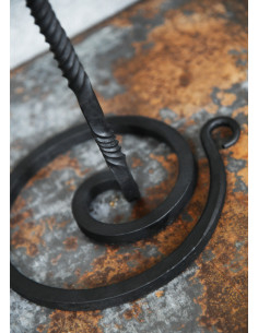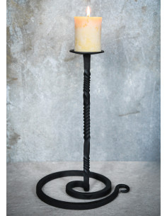 With its wrought iron design, this candle holder rises on a spiral base adorned with an elegant twisted stem. Every detail reflects quality craftsmanship, offering not only beauty but also a robustness that makes it the ideal companion for your candles or to display a warrior's helmet. Imagine the atmosphere it creates by illuminating a dinner with friends or as the centerpiece at a medieval market; its presence is simply captivating.