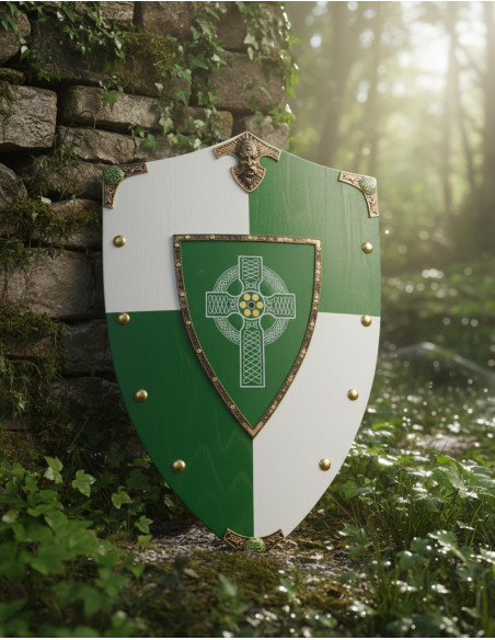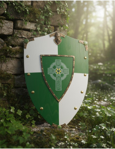 This shield combines the visual strength of a classic design with a palette that breathes character, thanks to its alternating quadrants in green and white tones, and a center that stands out with a small dark green shield featuring a white Celtic cross adorned with intricate strokes. The golden rivets and metallic decorations in the corners provide a finish that ensures the piece is not overlooked.