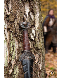 Discover the Celtic Sword Battleworn series from Epic Armoury, the perfect weapon for LARP lovers. Measuring 85cm in length from point to pommel, this sword features a double-edged blade designed to cut perfectly. Its detailed cross pommel and crescent pommel feature gold accents that add a touch of elegance and protect a sculpted grip, providing security and comfort during combat.