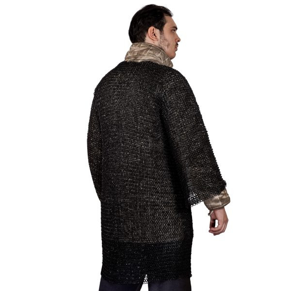 Haubergeon chain mail with riveted round rings. The robust 18 gauge MILD STEEL ROUND RINGS (diameter approx. 9mm), with alternating flat rings, are meticulously DOME RIVETED by our skilled craftsmen. The intricately interlocking pattern in a FOUR IN ONE pattern ensures protection against surprising attacks. It comes in Medium, Large, X-Large, and Double X-Large sizes so you can choose the fit that's right for you.