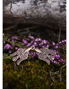 This cloak clasp in the shape of two beautiful ornate birds is a real treasure. The motif of the two birds is a representation of Odin's faithful messengers, Hugin and Munin (or Huginn and Muninn), a recurring motif in Celtic and Viking art. In Norse mythology, ravens fly over Asgard and Midgard and return each night to the Father of All Gods (also known as Hrafnáss, the 'raven god') to tell him all that they have seen and heard.