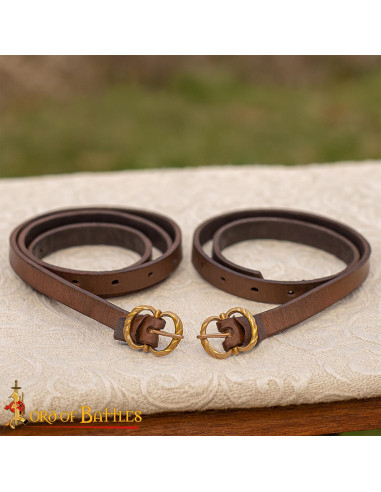 These garters revive a historic piece commonly used by travelers and warriors, making them invaluable for Renaissance fairs, reenactments, and LARP events, where every detail counts in recreating faithful environments. Being handmade, each pair shows slight variations in color and texture, making each set a unique piece.