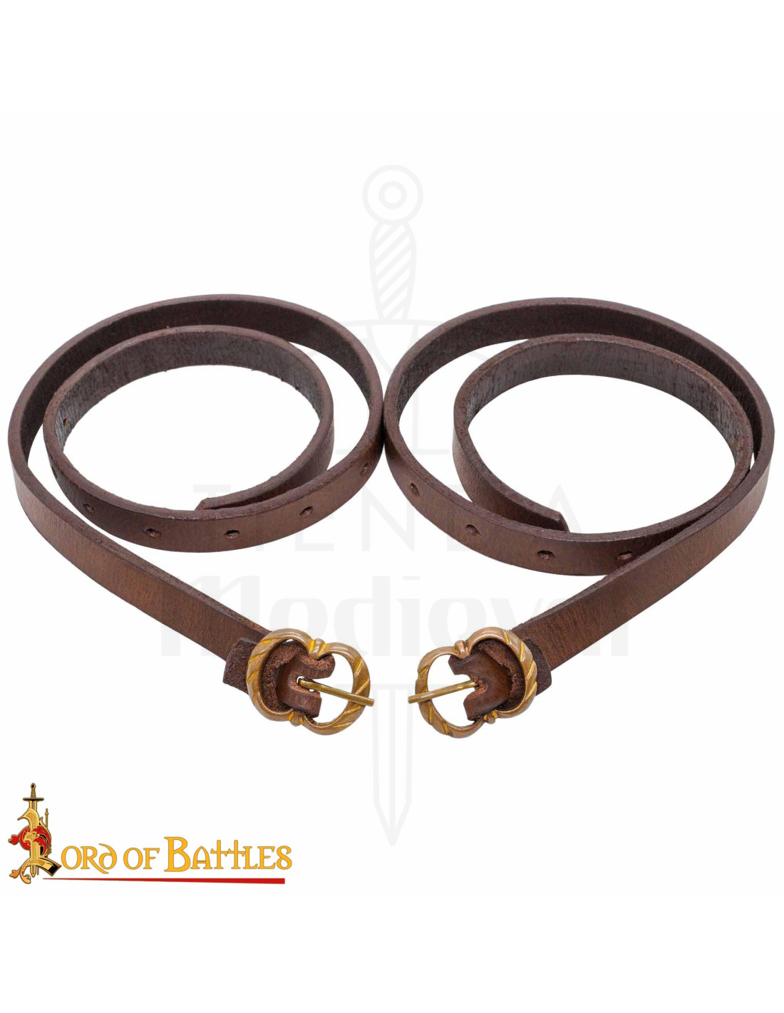 Designed for easy adjustment, the straps show several holes that allow for a secure and personalized fit, adapting to movement and ensuring that the garment stays in place during fair days or lengthy reenactment events. The golden metallic buckles, with a slight decorative waviness and classic prong, offer a firm, comfortable, and character-rich closure, adding that rustic nod that completes any outfit inspired by the Middle Ages.