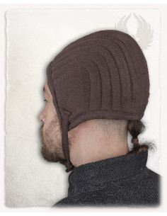 Prepare for battle with the Leopold medieval quilted crepe in a distinctive brown color! This padded crepe, like a classic crepe, is fastened under the chin with two robust cotton straps. When worn under a helmet, it provides added comfort and protection. But that is not all! You can also wear it as a standalone accessory.