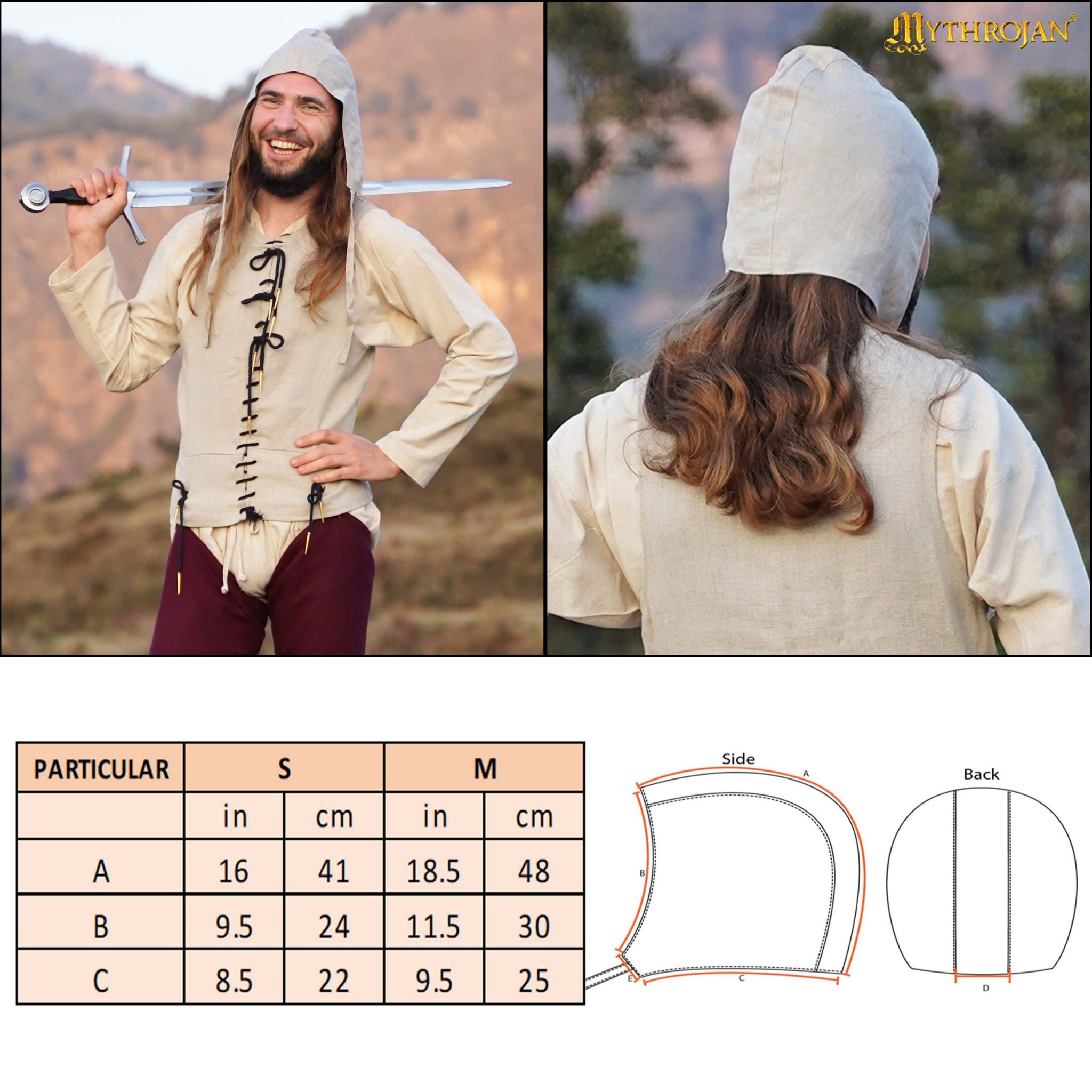 This design combines simplicity and functionality. During the medieval period, coifs and crespinas like this were essential: soldiers and knights wore them under their helmets for protection against chafing and to absorb sweat, while peasants used them to shield themselves from the weather and work more comfortably. Its snug design under the chin ensures it stays in place, even during dynamic activities.
