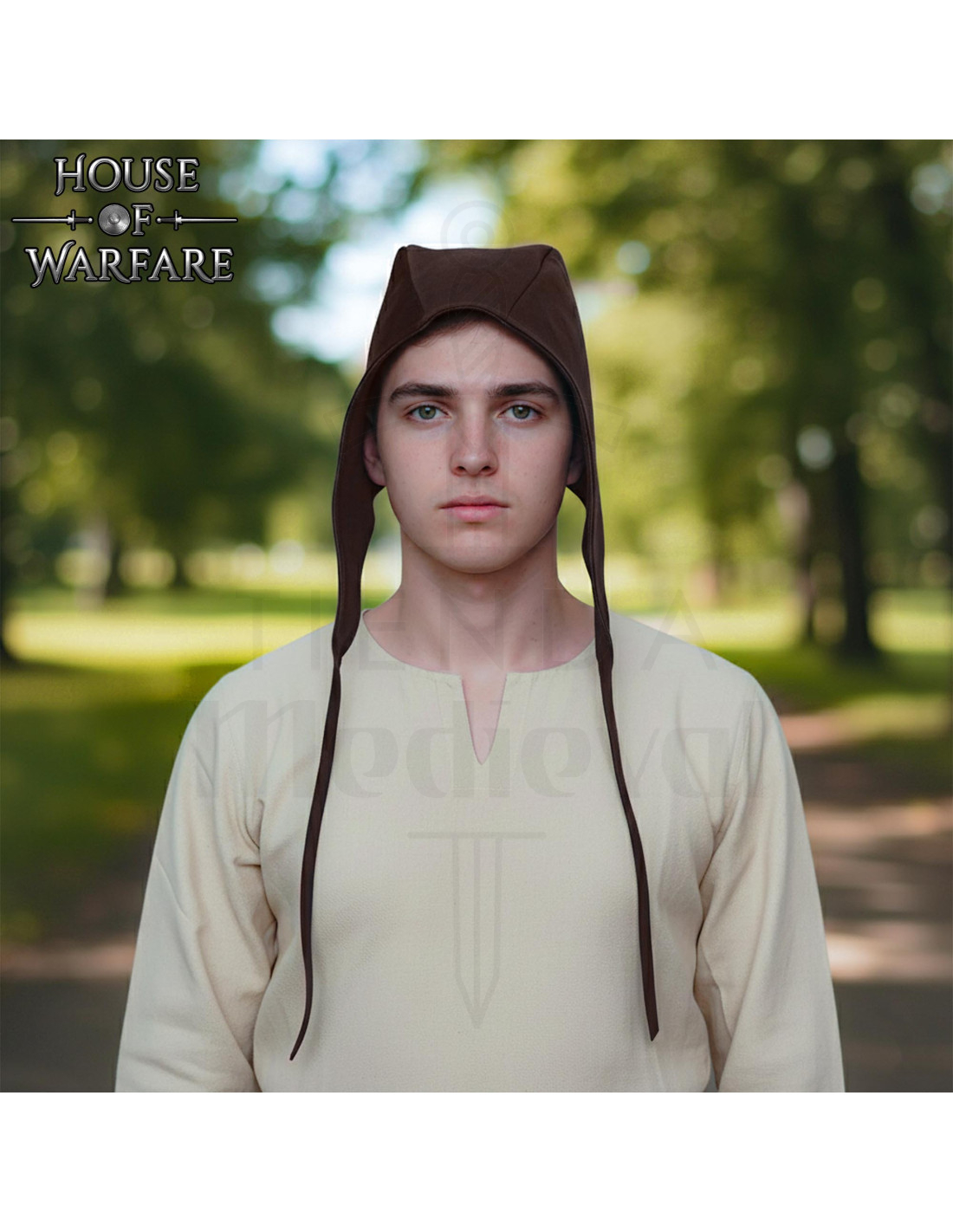 Brief historical context: this piece is inspired by the caps worn by peasants, artisans, and travelers of medieval Europe, reflecting the need for daily protection against the sun and wind, while offering the same aesthetic and functional value in reenactments and costumes today.