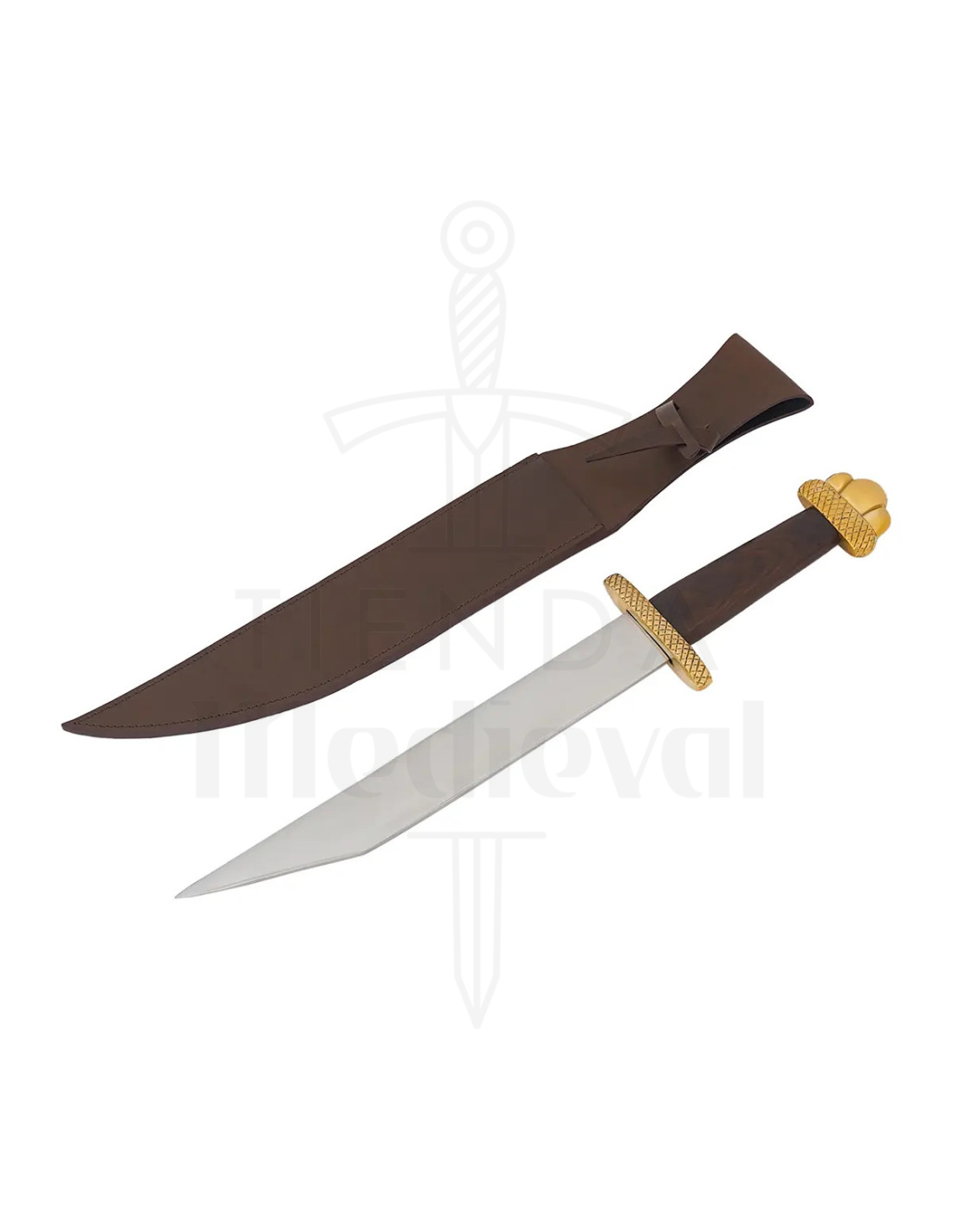 The sheath, in a dark brown tone and leather-like construction with visible stitching, protects the piece and facilitates its transport. Its wide top flap and clasp closure ensure that the dagger remains securely in place, ready to be drawn when the occasion demands.