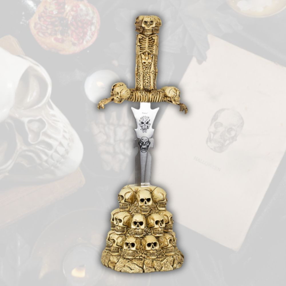 The handle, made of resin, has been sculpted with exquisite details that simulate bones and skulls, accentuating that particular gothic-macabre style. The stand, made of resin and decorated with multiple skulls arranged in layers, adds a sculptural and solid touch to the piece. With considerable dimensions, this base ensures that the dagger looks imposing from any angle. Ideal for those with an interest in the dark, the occult, or thematic decor, this dagger is much more than a simple object; it becomes a piece capable of telling stories. Perfect for gifting or adding to your own collection.