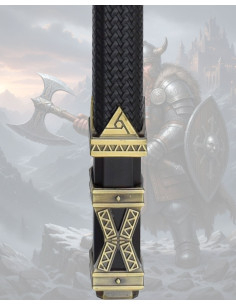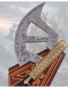 This replica captures the rugged and crafted look of the most remembered weapon by fans, offering a metallic finish that simulates veins and aging, making the piece look as if it came straight from a dwarven forge. The asymmetrical design of the blade and the gaps in its structure create a play of light and shadow, adding character and presence without losing decorative elegance.