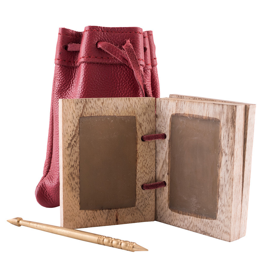 The heart of this pack is the Wax Book of Ulfberth, a historical recreation of the tablets used by senators and generals before the popularization of paper. Composed of four wooden panels, it allows you to jot down notes and tactics with the included brass pencil. Its clever design allows you to erase marks using the flat end of the stylus, offering an endless canvas for your creativity. The entire set is safeguarded in a high-quality leather case, designed to hang from your belt like an authentic Roman scribe or officer.