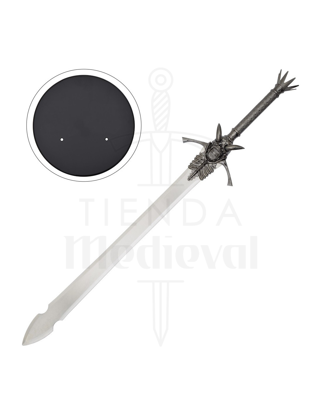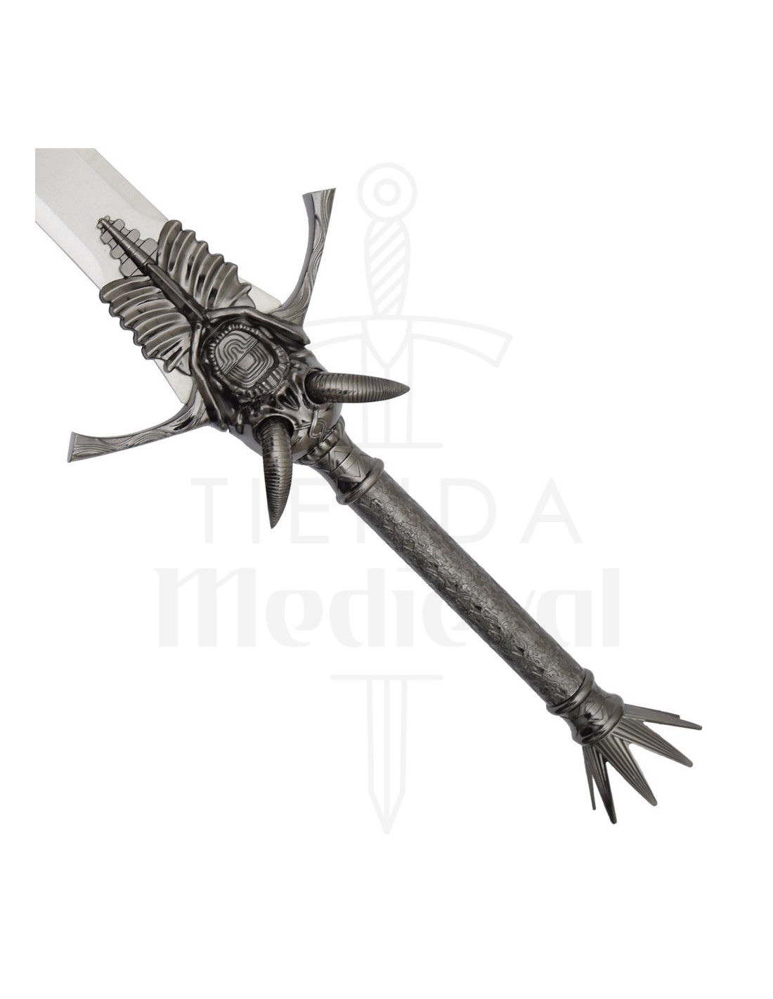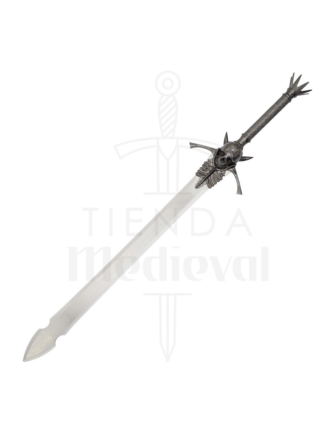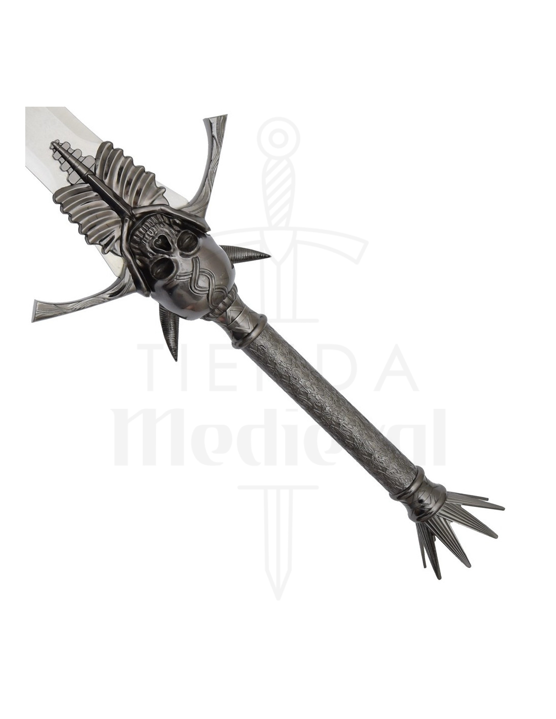 The design is not just aesthetic; it also enhances the experience: the dark, textured grip provides a firm hold, allowing you to pose or wield it confidently, while the guard decorated with skulls and ribs, along with the side spikes, adds character and a theatrical feel that elevates every photo or display. The crown of spikes at the tip of the handle adds that dramatic touch that defines its gothic and decorative style.