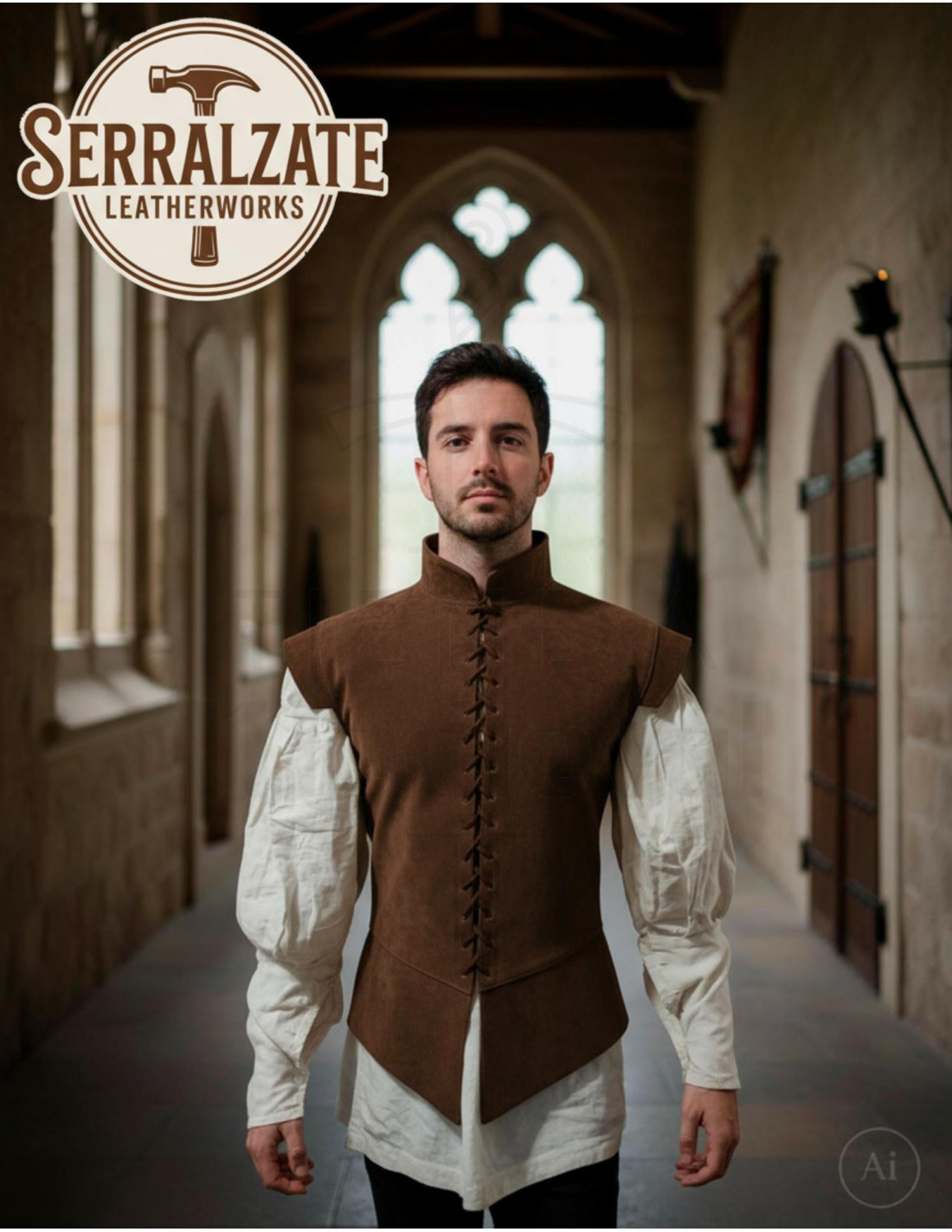 This jerkin fuses tradition and functionality, crafted from authentic suede that offers a soft texture to the touch and durability intended to accompany you on multiple occasions. The handmade construction and leather lace closure not only enhance its aesthetic but also facilitate a comfortable and customizable fit, ideal for those who value both style and practicality.