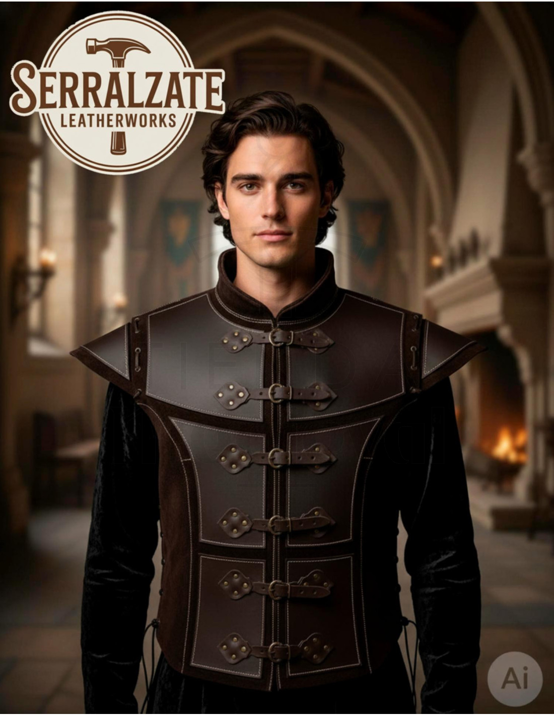 This jerkin conveys presence and authenticity, designed for those who value quality and the mark of handcraftsmanship. The authentic leather offers a warm touch, adapts with use, and enhances its character over time, meaning wearing it is to enjoy a garment that gains personality with you. Made by renowned artisans in Spain, each seam and finish reflects traditional care, ensuring a comfortable fit and a silhouette that enhances posture without sacrificing mobility, ideal for long days at fairs, shoots, or reenactments.