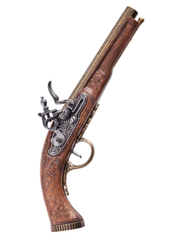 In addition to its imposing design, this flint pistol has a wide muzzle that made it easy to load buckshot into its barrel. It was very popular with the naval forces and the feared pirates of the time, making it a true historical treasure.