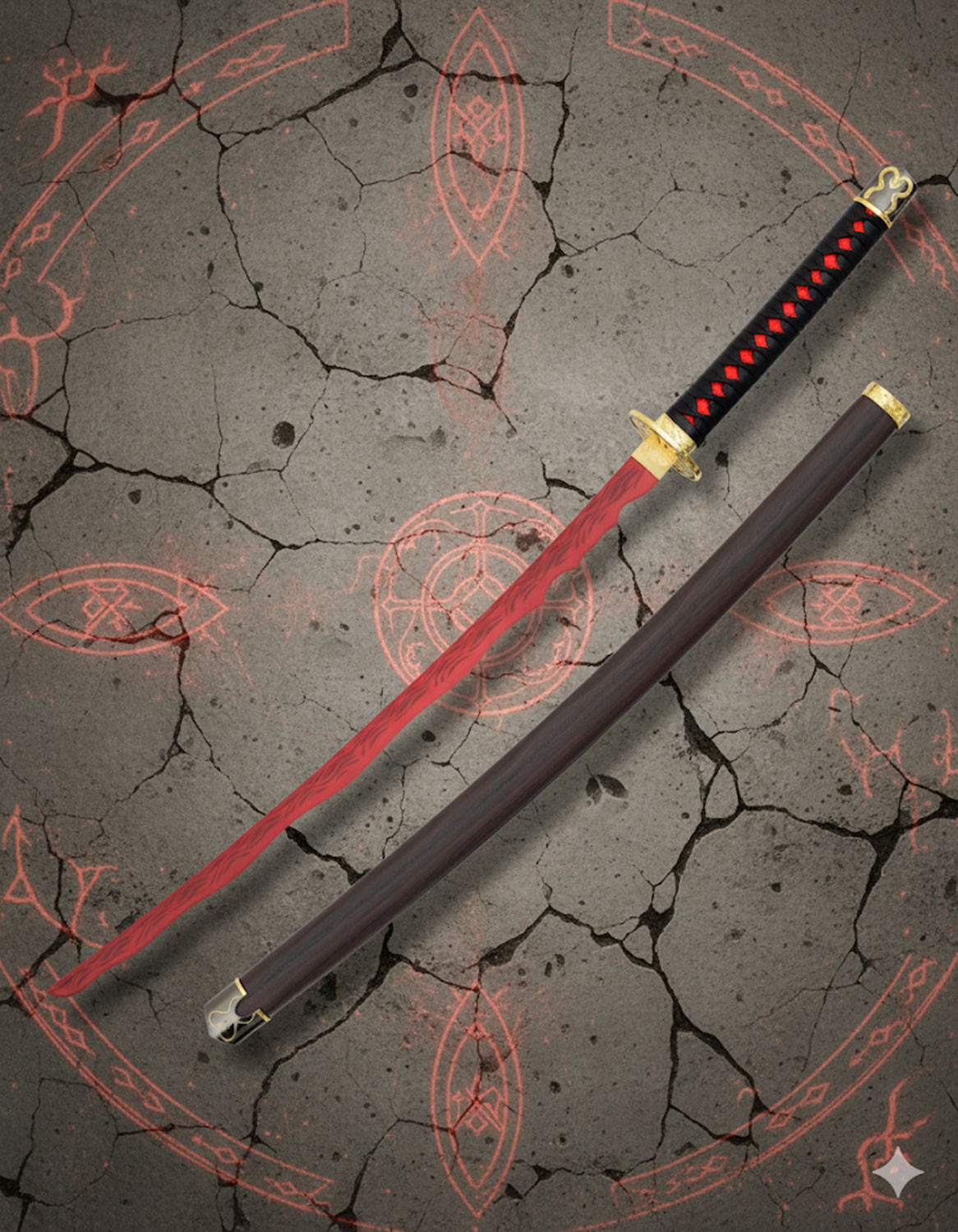 Its 650mm steel blade in vibrant red features a unique pattern, evoking the power and mystery of the weapon in the game. The sturdy gold and black metal tsuba adds a touch of elegance, while the braided black and red handle is not only durable but also provides a comfortable and striking grip. The dark brown wooden sheath completes its look, accompanied by metallic details that enhance its ornamental character.