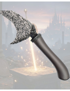 The curved, pointed blade offers a dramatic presence that transforms any showcase or corner of your collection into the center of attention. Its speckled texture in shades of gray and black adds visual depth, creating an aged and crafted appearance that enhances the decor without the need for accessories. The ornamental relief near the handle adds a handcrafted detail, perfect if you're looking for a piece with personality and character.