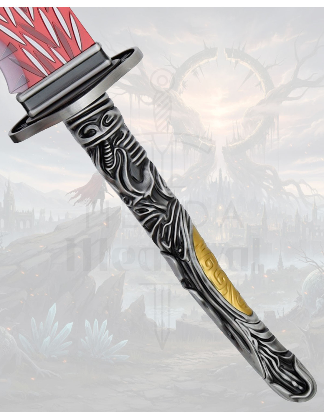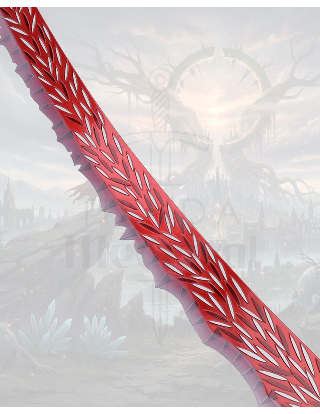 The Great Ornamental Sword of the Dragon Hunter, Elden Ring comes with a stunning finish: a curved blade in red tones adorned with white motifs reminiscent of feathers, and an edge with scalloped details and spikes that convey movement even at rest. This thoughtful design brings a dramatic presence, perfect for display in a living room, study, or gaming corner, and for those seeking a characterful replica to complement their setup or themed collection.