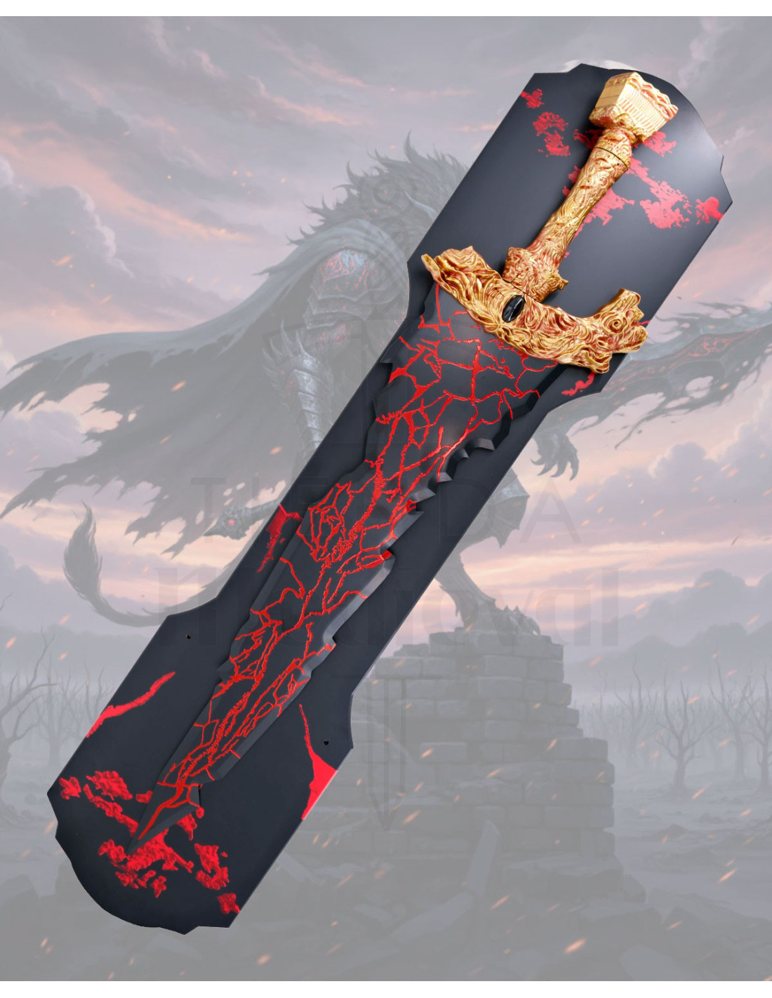 This replica captures the essence of Maliketh's Black Sword with a deep black finish and red veining that seem to pulse, creating a decorative piece that conveys intensity and character. The irregular outline of the blade and side notches add an aggressive aesthetic, perfect for adding personality to a collector's corner.