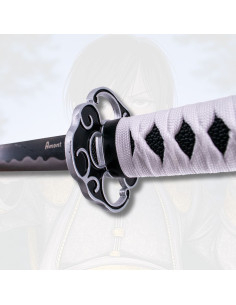 Its black blade with a wavy edge combines elegance and strength, creating a striking visual contrast alongside the white-wrapped handle and black sheath. Every detail has been thoughtfully crafted to offer a balanced and eye-catching piece, perfect for those seeking aesthetic quality and fidelity to the series' universe.