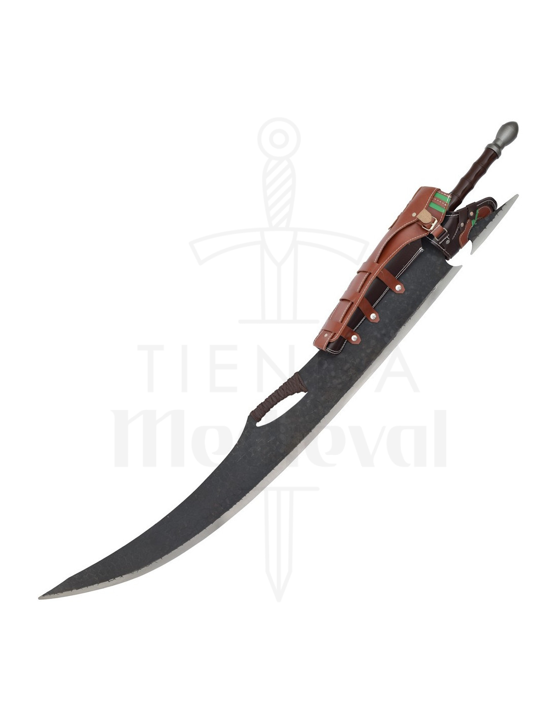 The brown sheath with green and black details, straps with silver closures, and visible stitching make storage part of the spectacle, providing an elegant solution for both wall hanging and transport to events. Everything is designed to make the presentation as striking as the sword itself.