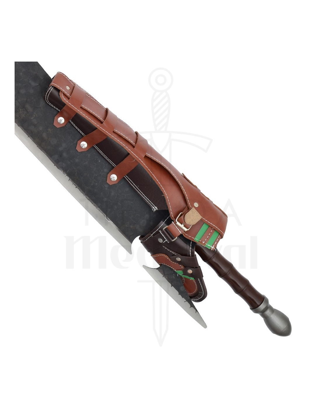 With a design that respects the game's aesthetic, this replica offers an imposing presence without compromising safety, thanks to its blunt blade designed exclusively for ornamental purposes. That textured metallic appearance in black and the decorative opening next to the handle add visual authenticity, while the parts made of cord and synthetic leather add character and realism to the whole.
