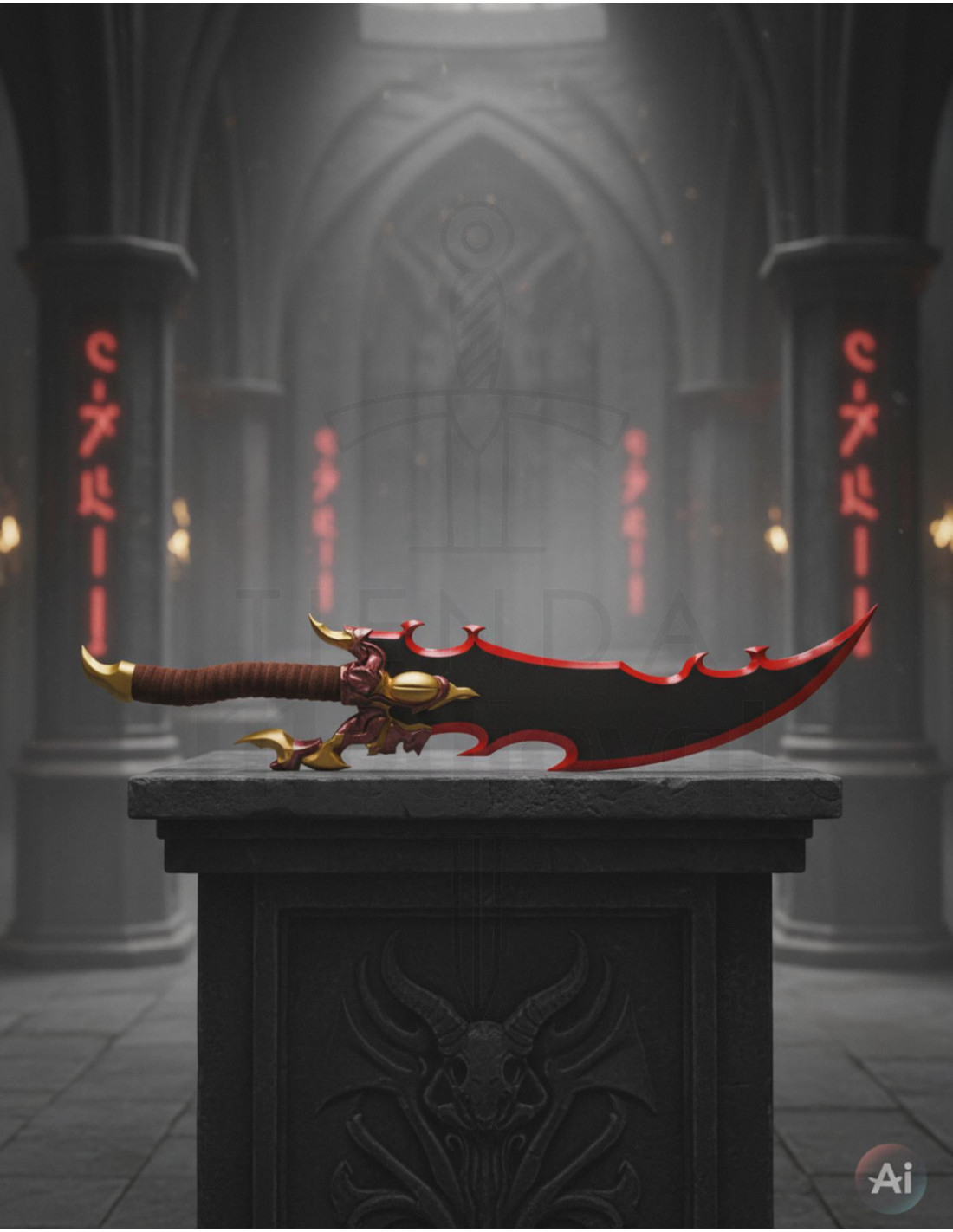 Are you looking for a display piece that captures the essence of darkness and the power of the Demon King? This decorative replica of the Short Sword of the Demon King from Solo Leveling is the perfect touch for any fan who wants to showcase their passion for the series without worrying about functional use. With a total length of 62 cm and a blade of 4 cm decorated in black with an striking red cut, its sleek design and gold details on the guard and handle enhance its impressive finish.