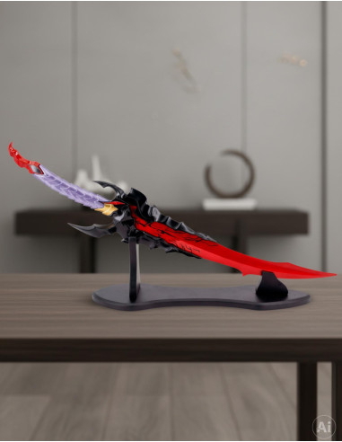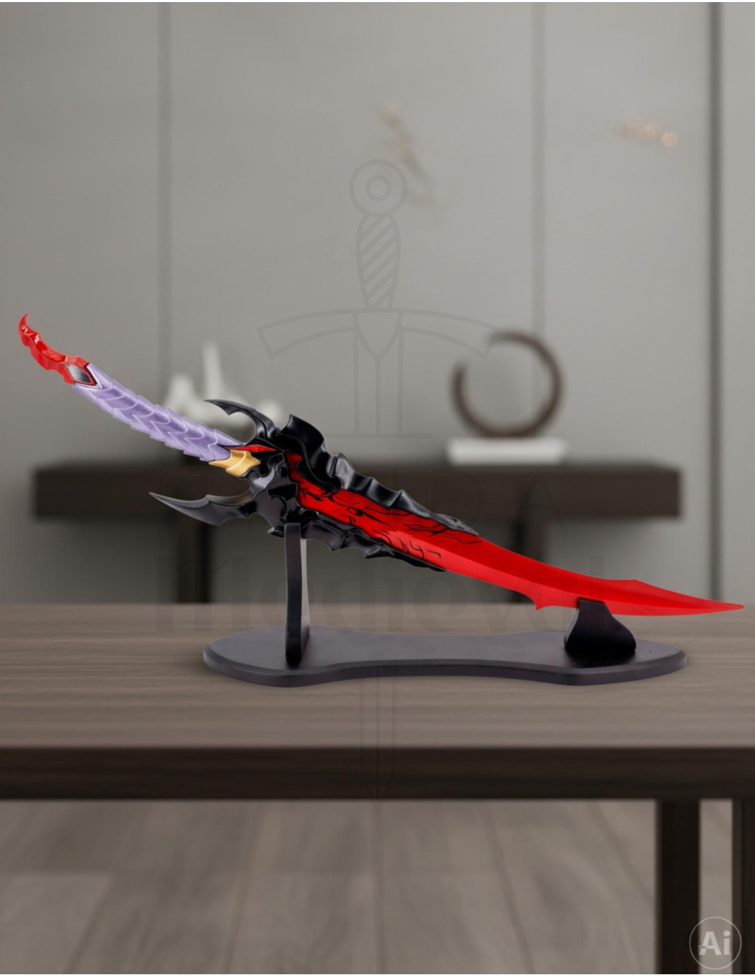 The 4 mm thick blade features a finish that combines fine black and red details, with a base that simulates claws or extensions, emphasizing its fierce character. It includes a stand that makes it easy to display in any space, making it an ideal addition to themed decorations or collections. Perfect for decorating your room, office, or game room, this piece combines visual quality with an impactful design, especially made for those who want to showcase their passion for Solo Leveling without the need for combat functionality. The image shows an object with an elaborate and aggressive design, with vibrant colors and details that enhance its fantastic and heroic character. Get this spectacular decorative sword and bring the strength of Kamish's universe into your environment!