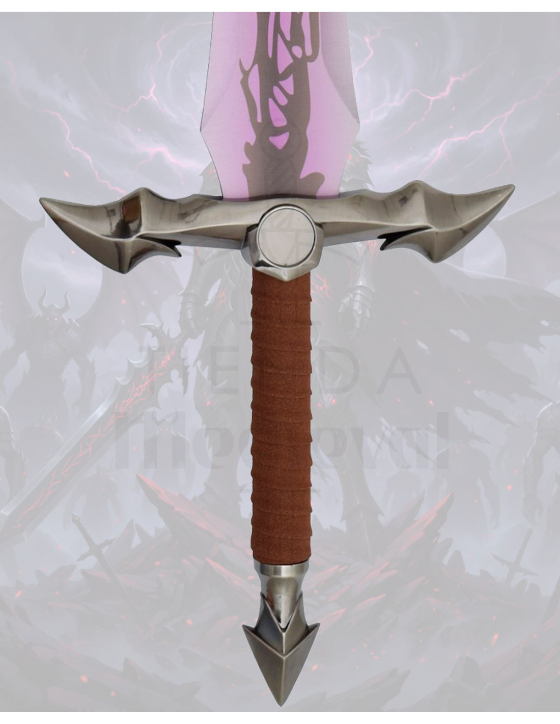 Inspired by the sword of the Demon King Sung Jinwoo, one of the most recognizable figures from the Solo Leveling phenomenon, this unofficial replica evokes that powerful and mysterious aesthetic, serving as the ideal visual centerpiece for your collection. Its blade features a decorative pattern in dark tones on a deep lavender background, creating a contrast that conveys drama and sophistication, while the sharp tip and straight edge maintain a bold visual line.