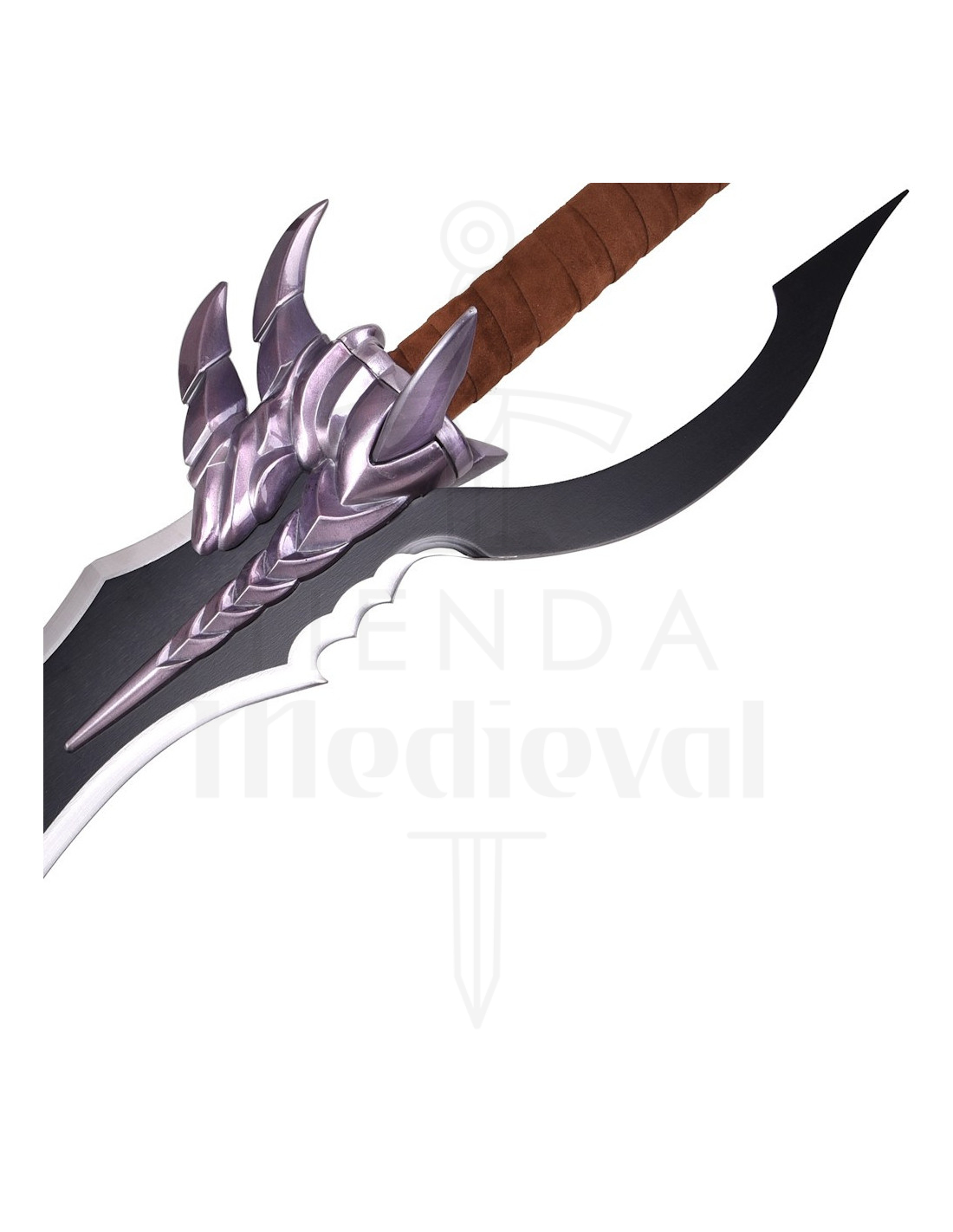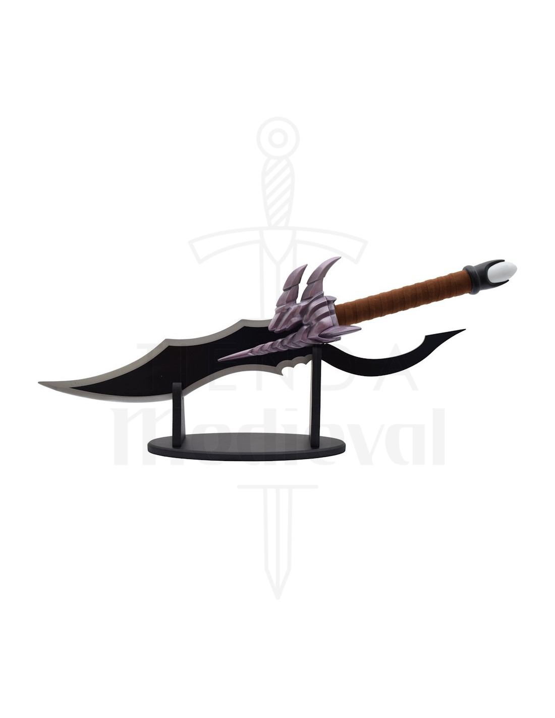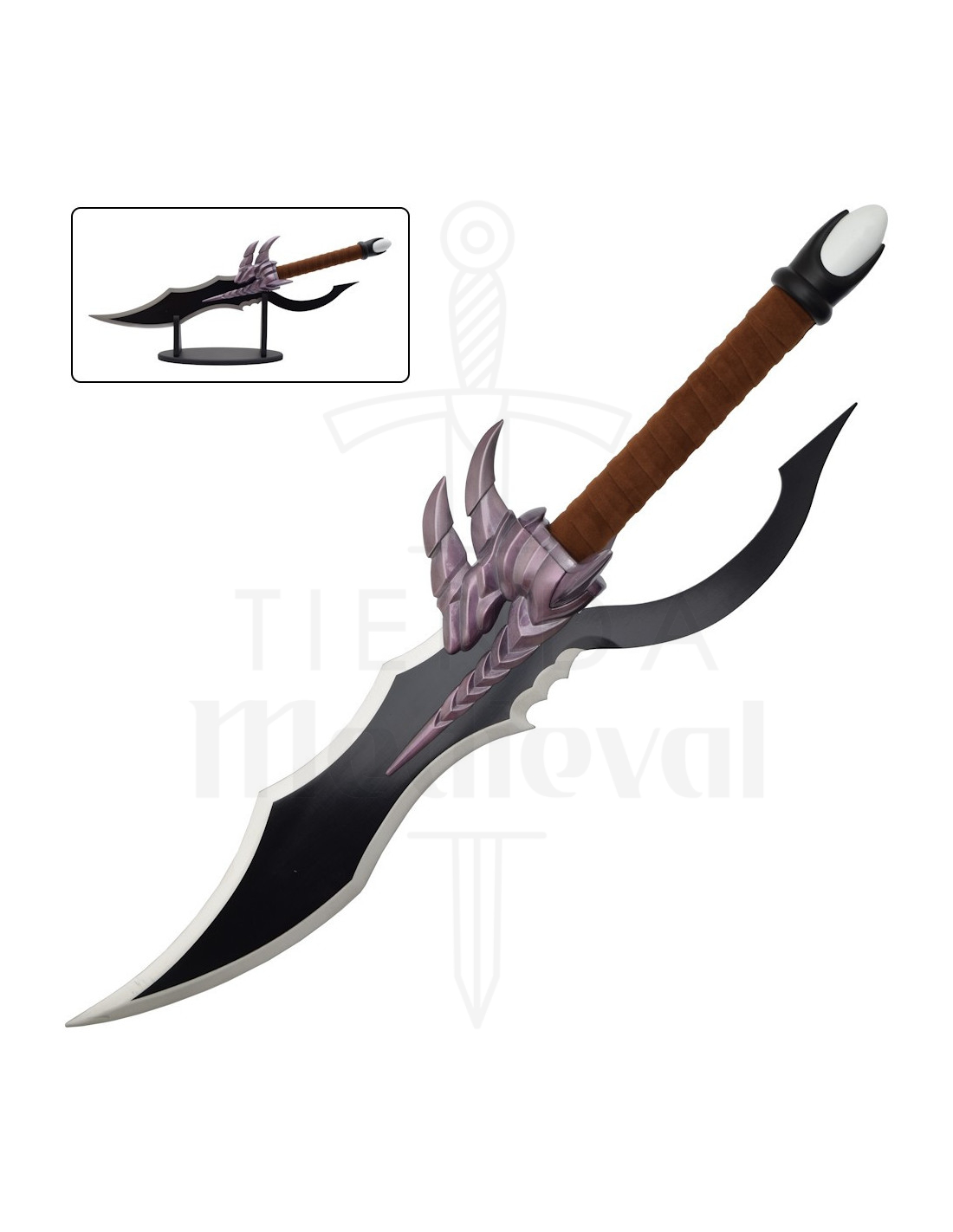 Con una silueta agresiva y estilizada, la hoja negra con filo plateado y contornos irregulares aporta dinamismo y carácter, ideal para quien busca un elemento decorativo que hable por sí mismo. El detalle tridimensional en tono morado metalizado, que simula una garra, añade profundidad y un acabado sorprendente que resalta en cualquier vitrina o pared.
