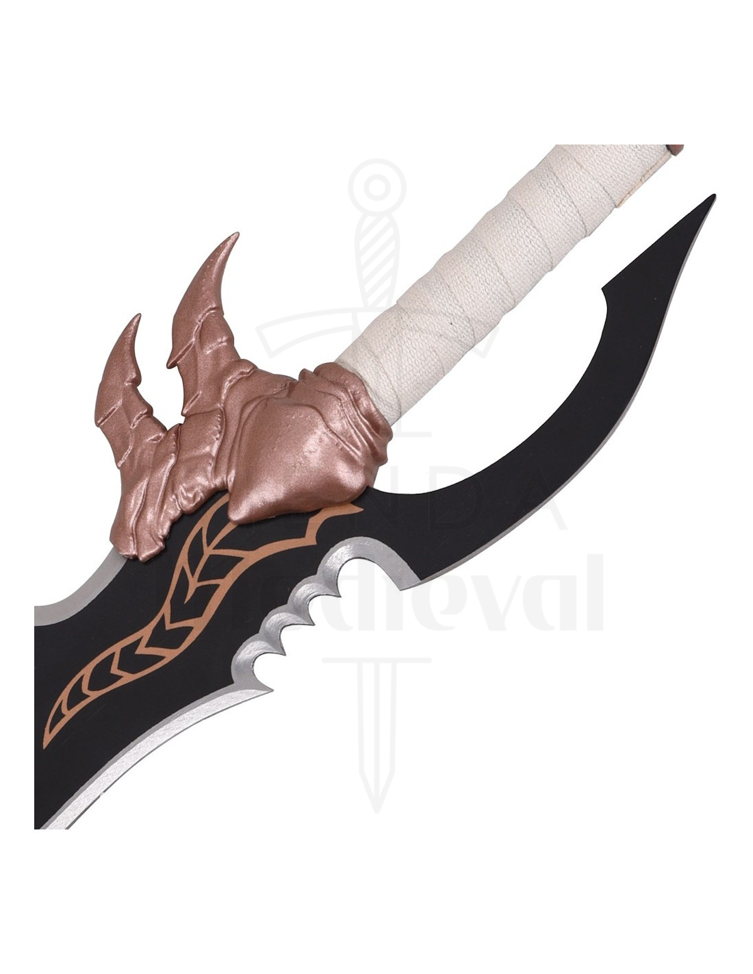 The irregular design of the blade, with wavy edges and saw-style notches, offers an aggressive look that seems to come straight from an epic scene. The black finish with copper touches gives it visual depth, making every angle reveal new details, perfect for those seeking a collection piece that stands out effortlessly.