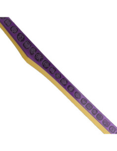 The elongated, curved blade offers an elegant and fluid presence, designed to catch the eye without dominating the space. The steel provides a metallic shine that enhances the reliefs and engravings along the piece, while the purple tones and golden details create a contrast that functions as a decorative focal point. The engraved motifs tell a visual story, turning the piece into a conversation starter, ideal for those who want to add personality to their favorite corner.