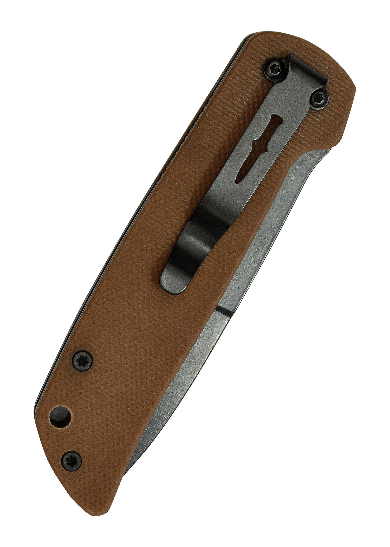 - Ergonomic G-10 Handle: The brown G-10 scaled handle offers a secure and comfortable grip in all situations. With its rough and textured surface, you will have optimal control over your knife at all times. Additionally, it features a lanyard hole and a belt clip for greater carrying versatility.