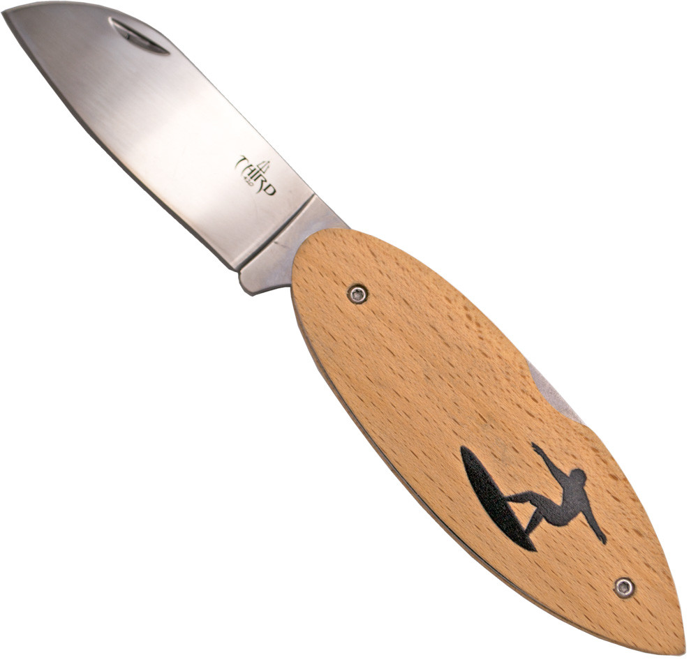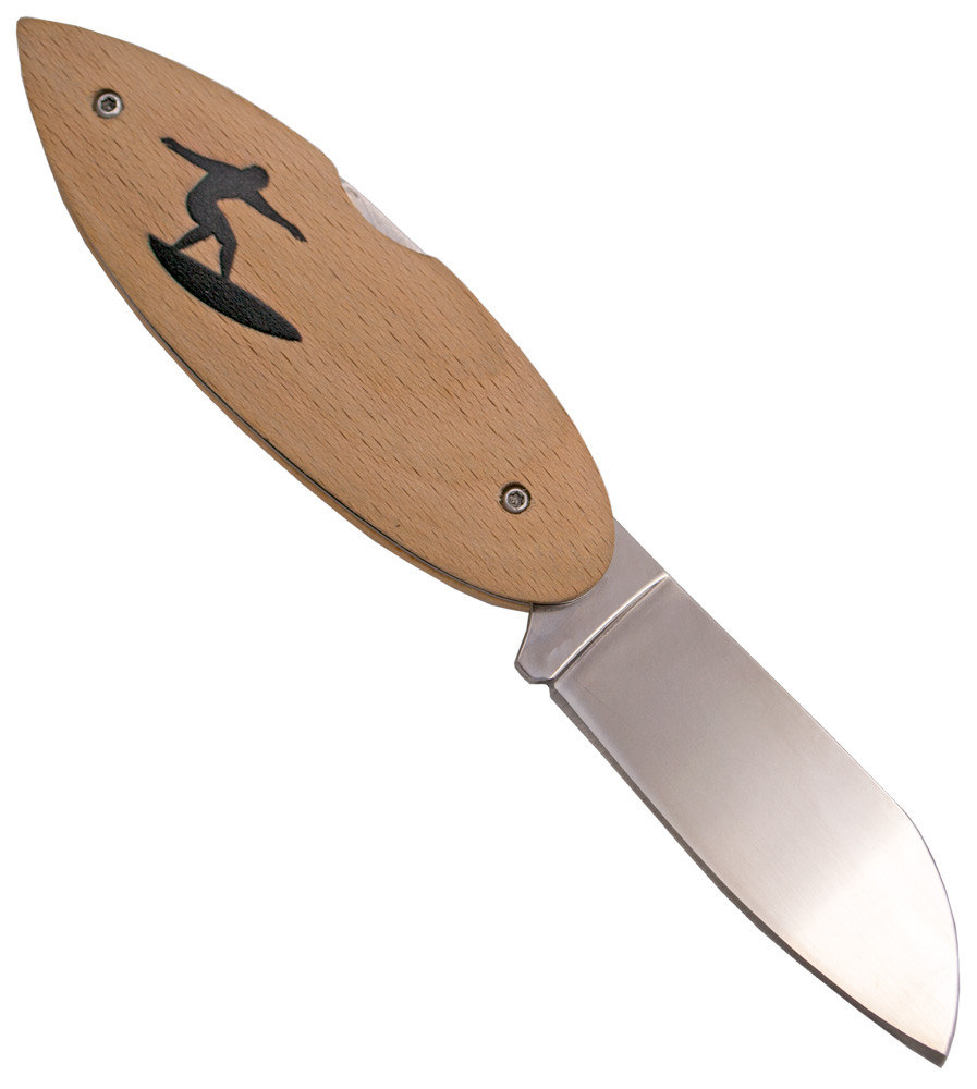 The beechwood handle offers a natural and warm feel to the touch, providing sturdiness and comfort during use. What makes the SURFER M2 model special is the print of a surfer on both sides of the handle, a detail that captures the essence of beach life and the love of surfing. This design not only adds character to the knife, but also provides a firm and secure grip.