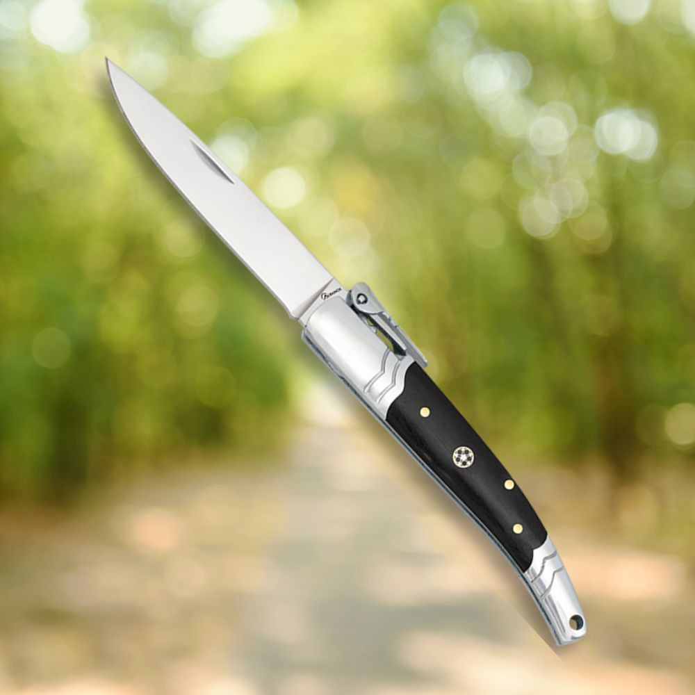 The black handle, decorated with ornamental rivets, stands out for its beauty and ergonomic design, providing you with a comfortable and secure grip. Its polished finish not only adds elegance but also gives a pleasant feel to the touch, while its lightweight makes this knife, weighing only 64.20 grams, the perfect companion.