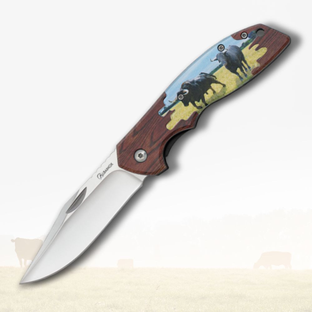 Discover the perfect combination of functionality and design with this decorated knife from Albainox. Ideal for both your outdoor activities and showcasing in a collection, this model stands out for its careful design of bulls in a prairie setting. Its 3D image and the earthy colors of the handle that mimic wood make it a unique piece that reflects strength and tradition.